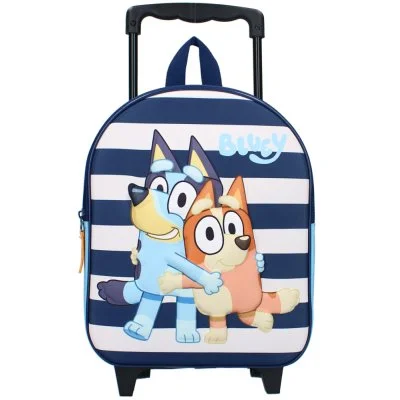 Dětský cestovní kufřík Bluey s obrázkem Bluey a její sestry Bingo na pruhovaném podkladu. ...