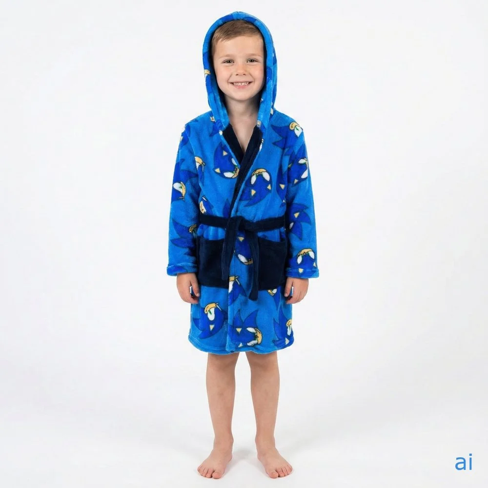 Dětský župánek Ježek Sonic s motivem nejrychlejšího ježka na světě. Má kapuci, dvě kapsy a pásek v pase. Vyrobený z mimořádně hebkého materiálu WellSoft. Dostupný ve velikostech 98, 104, 116 a 128.