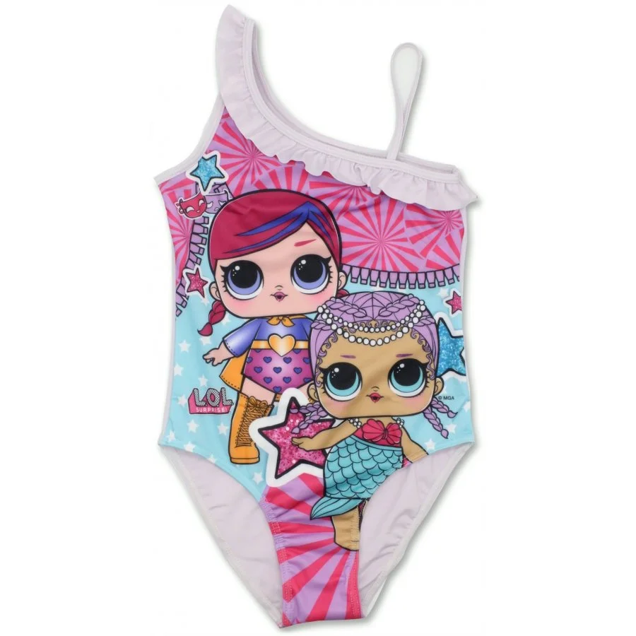 Holčičí jednodílné plavky L.O.L. Surprise. Asymetrické dívčí plavky s obrázkem okatých panenek ...