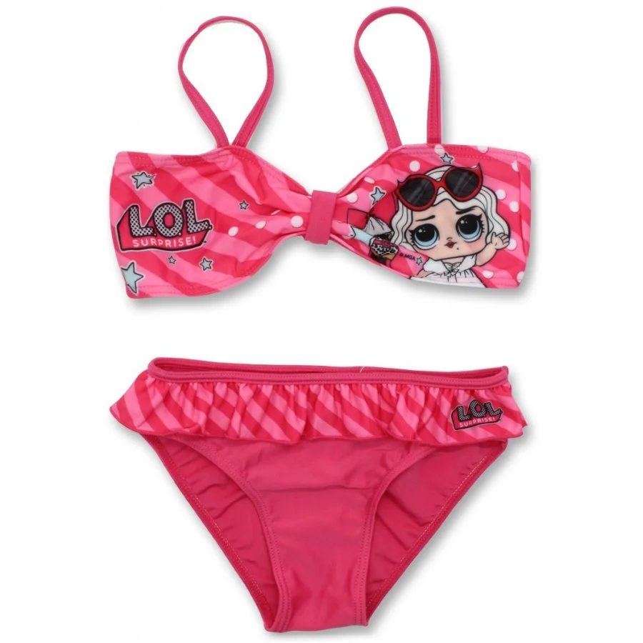 Dívčí bikiny L.O.L. Suprise. Tmavě růžové dívčí dvoudílné plavky s obrázkem okatých panenek LOL na horním dílu. Kalhotky mají v pase gumu, okolo pasu ozdobný volánek a v intimní části bílou podšívku. Horní díl má zezadu pružný pásek. Materiál plavek je elastický a rychle schne, takže se dobře přizpůsobí tělu a pohodlně se nosí.