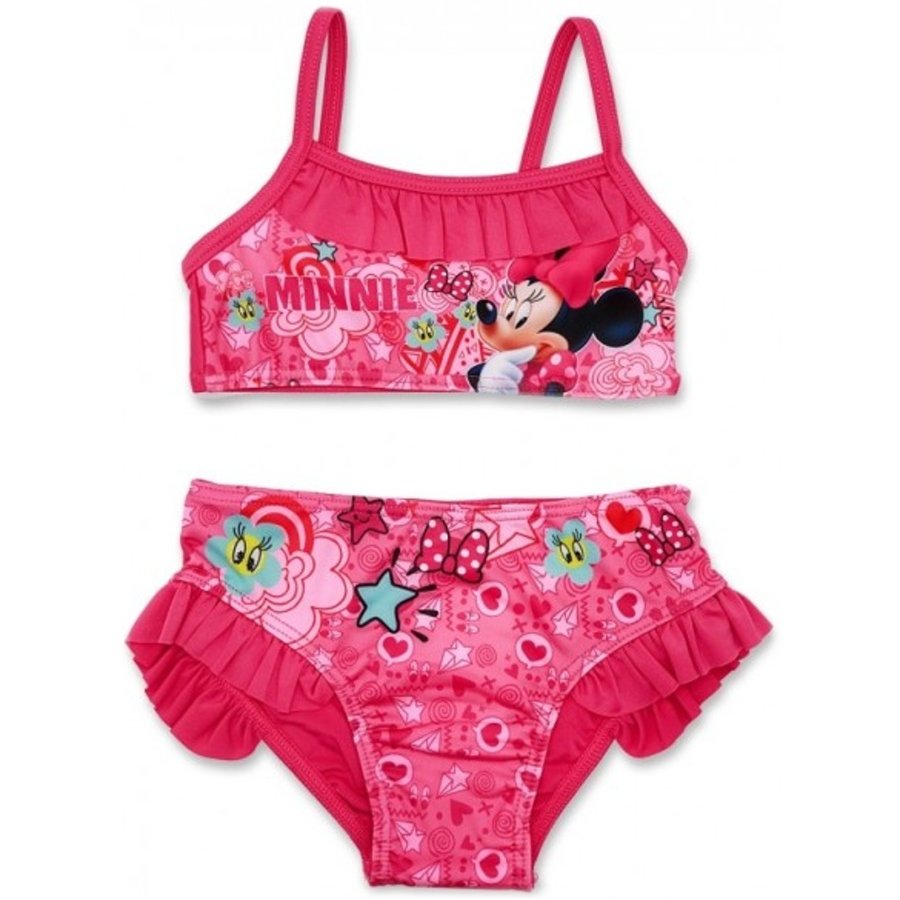 Holčičí dvojdílné plavky Minnie Mouse - Disney. Růžové dívčí bikiny s obrázkem oblíbené myšky Minnie, srdíčky a květinami. Spodní díl těchto plavek má v pase gumu a volánky okolo stehen. Horní díl má zezadu pružný pásek. Materiál plavek je poměrně elastický, takže se dobře přizpůsobí tělu a pohodlně se nosí.