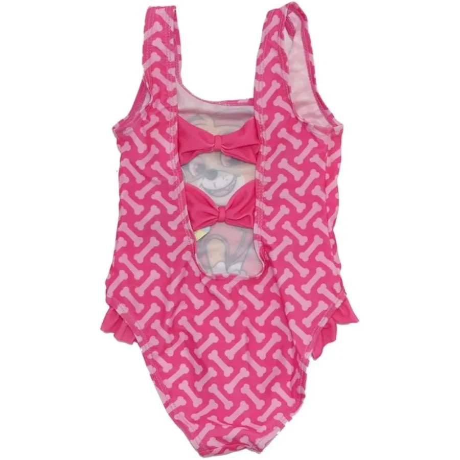 Holčičí jednodílné plavky Paw Patrol - Tlapková patrola - motiv Skye. Dětské plavky s obrázkem oblíbené členky party "tlapek" Skye s mašličkami na zádech. Z vnitřní strany spodní části je jemná bílá podšívka. Materiál plavek je poměrně elastický, takže se dobře přizpůsobí tělu, snadno se oblékají a pohodlně se nosí. Tyto plavky nabízíme ve světle růžovém provedení se žlutými symboly psích pochoutek - kostí, nebo v tmavě růžovém provedení se světle růžovými symboly kostí - viz výběr barvy a velikosti.