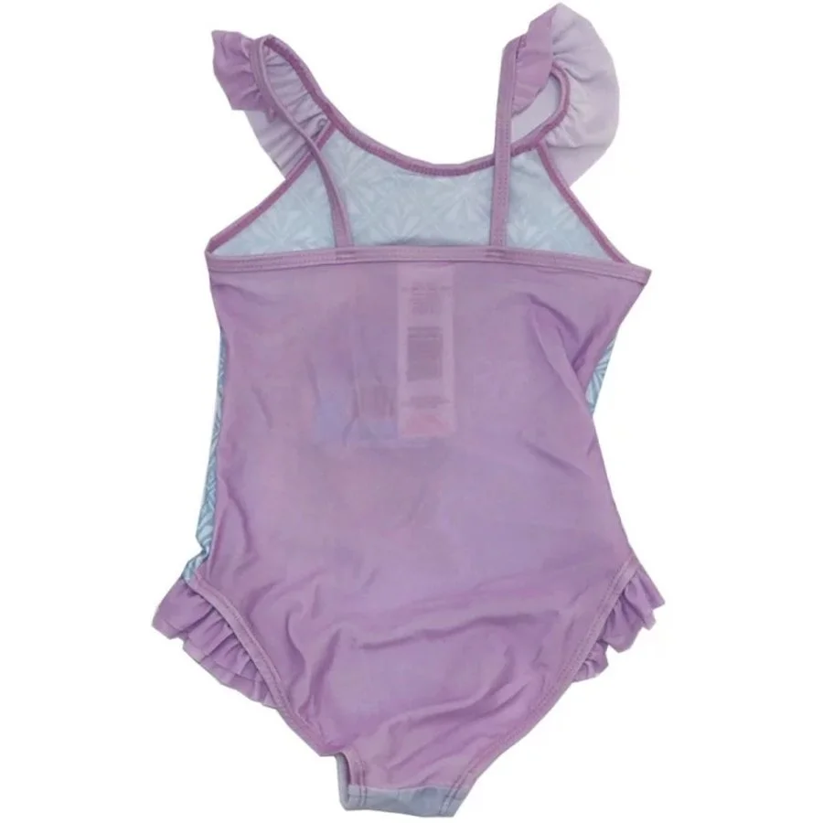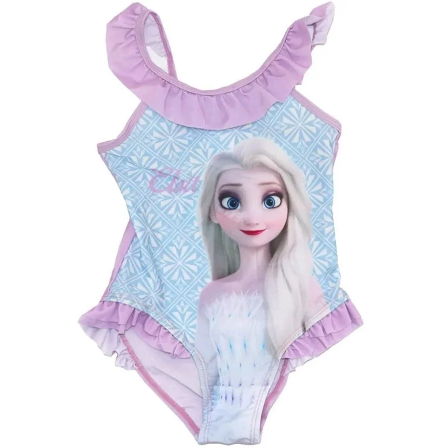 Holčičí jednodílné plavky Ledové království - Frozen. Zdobí je obrázek princezny Elsy, volánky okolo boků a na ramínkách okolo krku. Z vnitřní strany spodní části je jemná bílá podšívka. Materiál plavek je poměrně elastický, takže se dobře přizpůsobí tělu, snadno se oblékají a pohodlně se nosí.