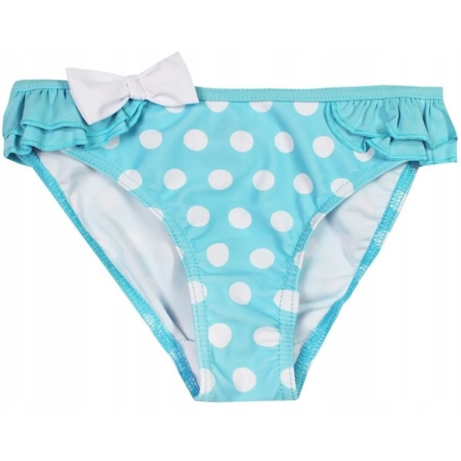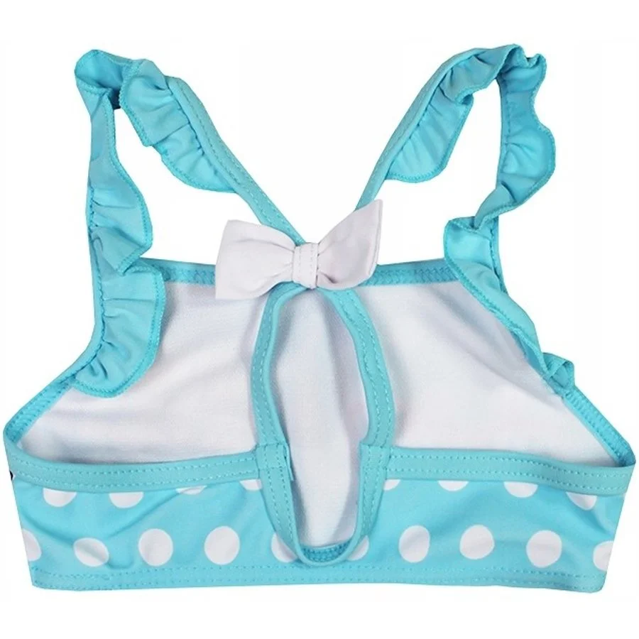 Holčičí dvojdílné puntíkované plavky Minnie Mouse - Disney. Horní díl plavek zdobí obrázek legendární myšky Minnie a nápis s jejím jménem na tyrkysovém, nebo žlutém podkladu s bílými puntíky - viz výběr barvy a velikosti. Spodní díl je ozdobený volánkem okolo pasu. To vše elegantně doplňuje bílá mašlička u pasu spodního dílu a ve spoji ramínek na zádech horního dílu. Z vnitřní strany spodní části kalhotek je jemná bílá podšívka. Materiál plavek je poměrně elastický, takže se dobře přizpůsobí tělu a pohodlně se nosí.