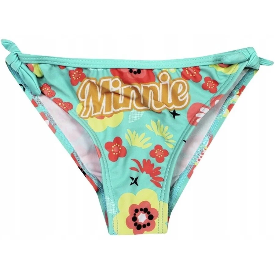 Holčičí dvojdílné květinové plavky Minnie Mouse - Disney. Horní díl plavek zdobí obrázek legendární myšky Minnie a nápis s jejím jménem na růžovém, nebo tyrkysovém podkladu se spoustou květin - viz výběr barvy a velikosti. Spodní díl je vysoko vykrojený a na bocích spojený uzlíky. I horní díl je na hrudi ozdobený ležérním uzlíkem. Z vnitřní strany spodní části kalhotek je jemná bílá podšívka. Materiál plavek je poměrně elastický, takže se dobře přizpůsobí tělu a pohodlně se nosí.
