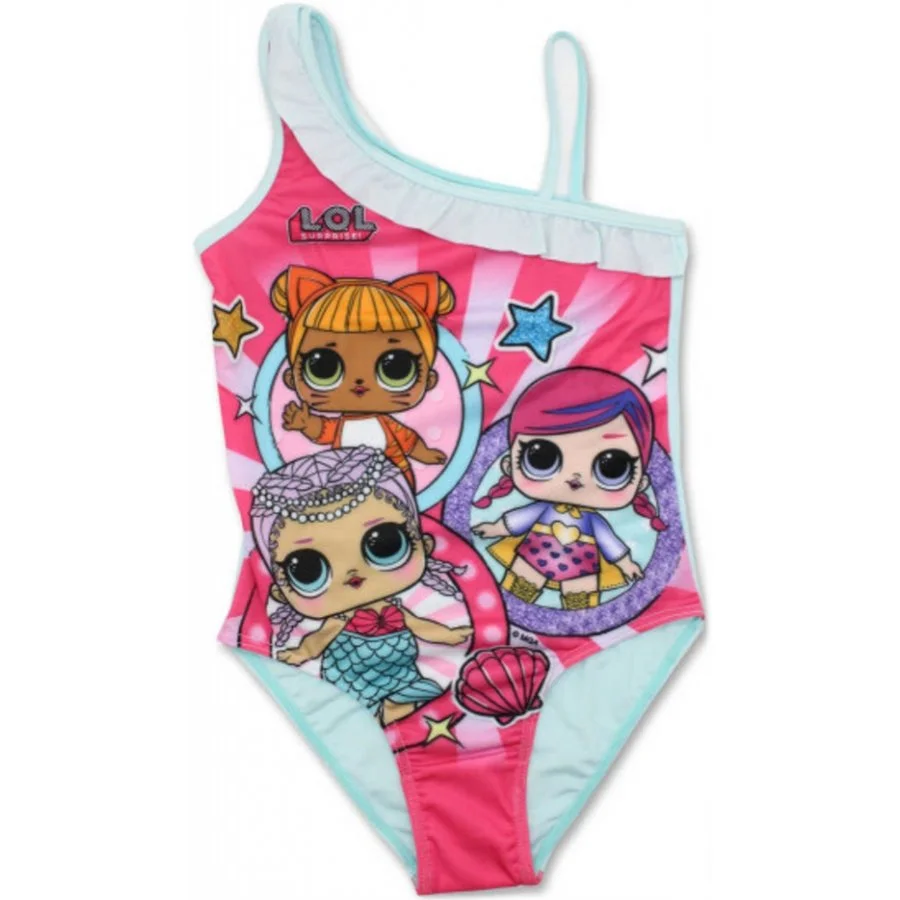 Holčičí jednodílné plavky L.O.L. Surprise. Asymetrické dívčí plavky s obrázkem okatých panenek ...