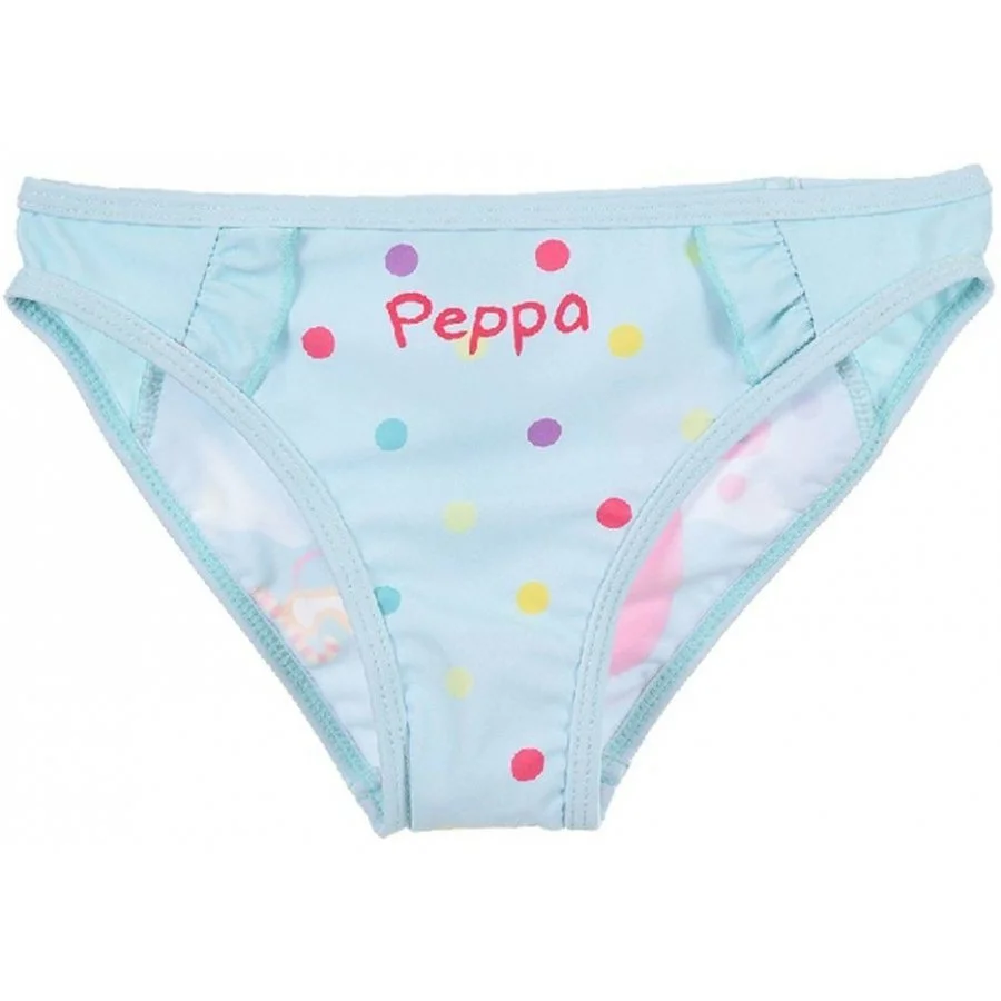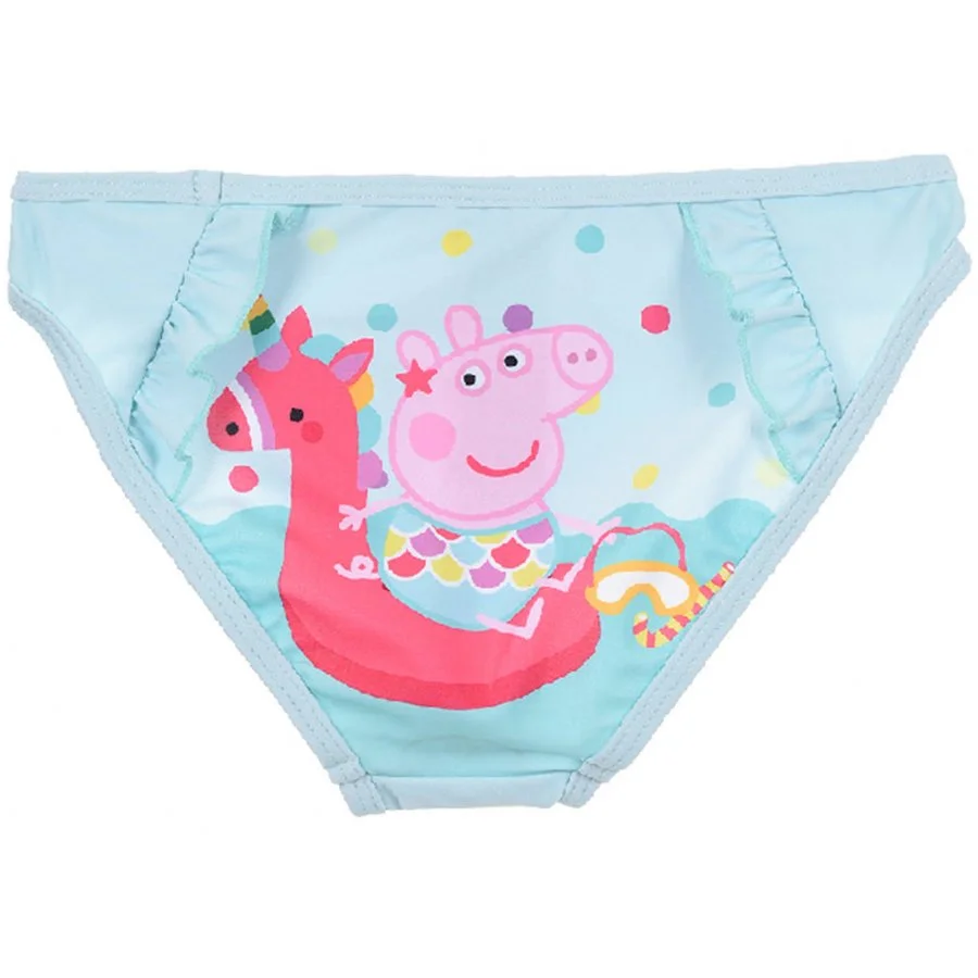 Spodní díl plavek pro holky Prasátko Peppa - Peppa Pig - s obrázkem prasátka Pepiny na nafukovacím jednorožcovi ze zadní strany a nápisem s jejím jménem ze strany přední. Navíc jsou tyto plavky z obou stran ozdobeny svislými volánky. V pase a v lemu nohavic mají všitou gumu. Materiál plavek je poměrně elastický, takže se dobře přizpůsobí tělu a proto se snadno oblékají a pohodlně se nosí. Tyto plavkové kalhotky nabízíme v růžové, nebo tyrkysové barvě - viz výběr velikosti a barvy.