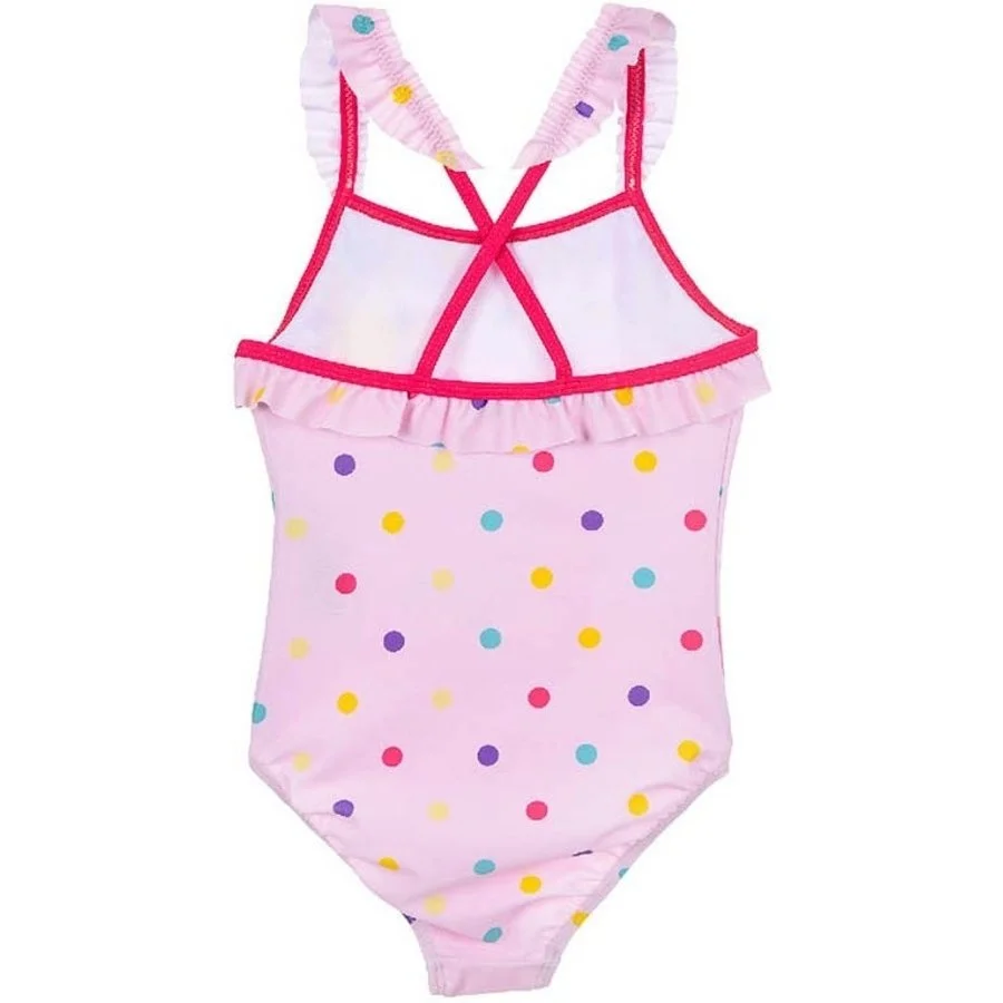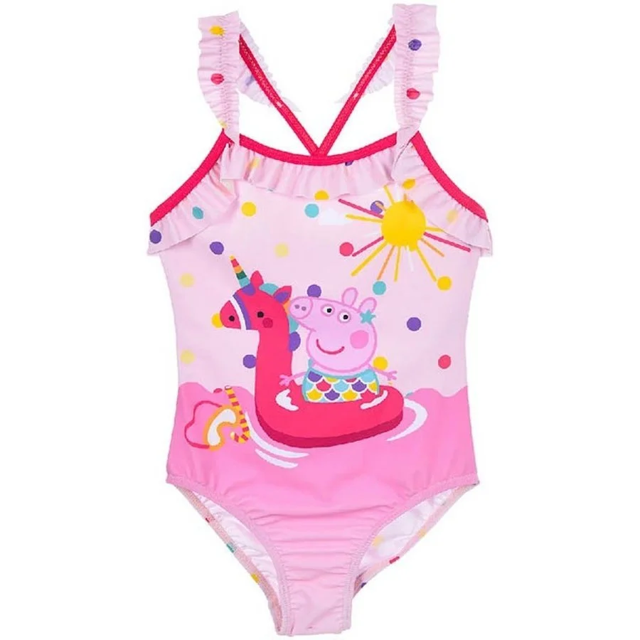 Dětské jednodílné plavky Prasátko Peppa s puntíky. Holčičí plavky s obrázkem prasátka Peppiny, která si užívá slunečný den ve vodě na nafukovacím jednorožcovi. Horní lom a ramínka jsou zdobená nařaseným volánkem. Materiál plavek je poměrně elastický, takže se dobře ... Celý text