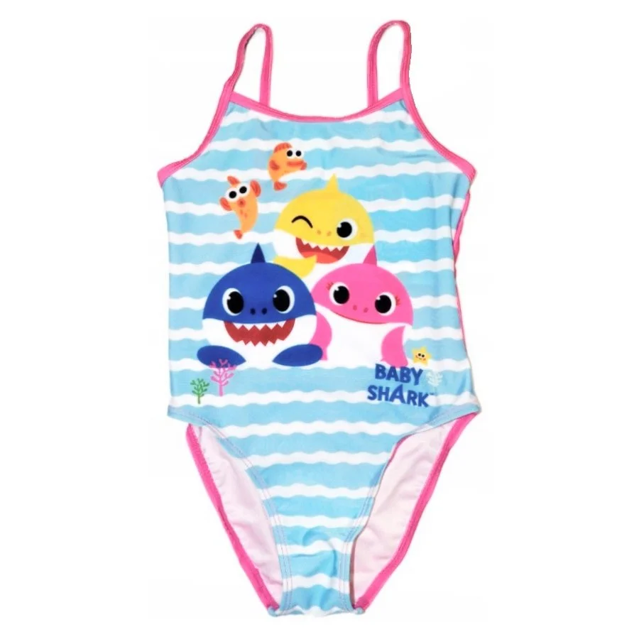 Holčičí jednodílné plavky Baby Shark. Dětské plavky s obrázkem žraločí rodinky na pozadí s modrými vlnkami. Ramínka, horní lem a celá zadní část plavek jsou růžové. Materiál plavek je poměrně elastický, takže se dobře přizpůsobí tělu, snadno se oblékají a pohodlně se nosí. Tyto dětské plavky Baby Shark nabízíme ve velikostech 92/98, nebo 104/110.