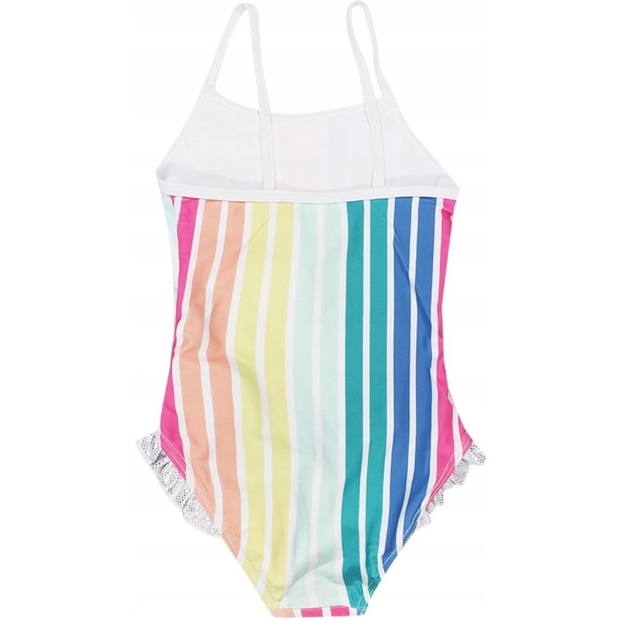 Jednodílné plavky pro holky Paw Patrol - Tlapková patrola. Dětské plavky s obrázkem oblíbené členky party "tlapek" Skye na pestrobarevně pruhovaném podkladu s barevnými otisky tlapek. Zadní díl plavek je také puhovaný. Okolo stehen je volánek se třpytkami. Z vnitřní strany spodní části je jemná bílá hygienická podšívka. Materiál plavek je poměrně elastický, takže se dobře přizpůsobí tělu, snadno se oblékají a pohodlně se nosí. Tyto plavky nabízíme ve variantě s růžovými, nebo bílými lemy a volánky - viz výběr barvy a velikosti.