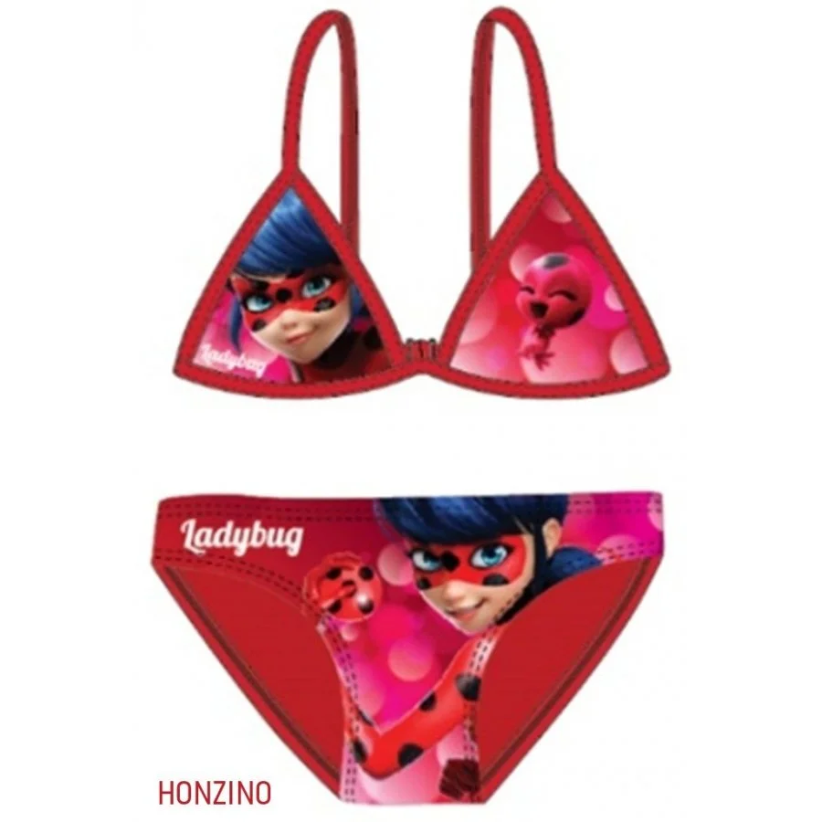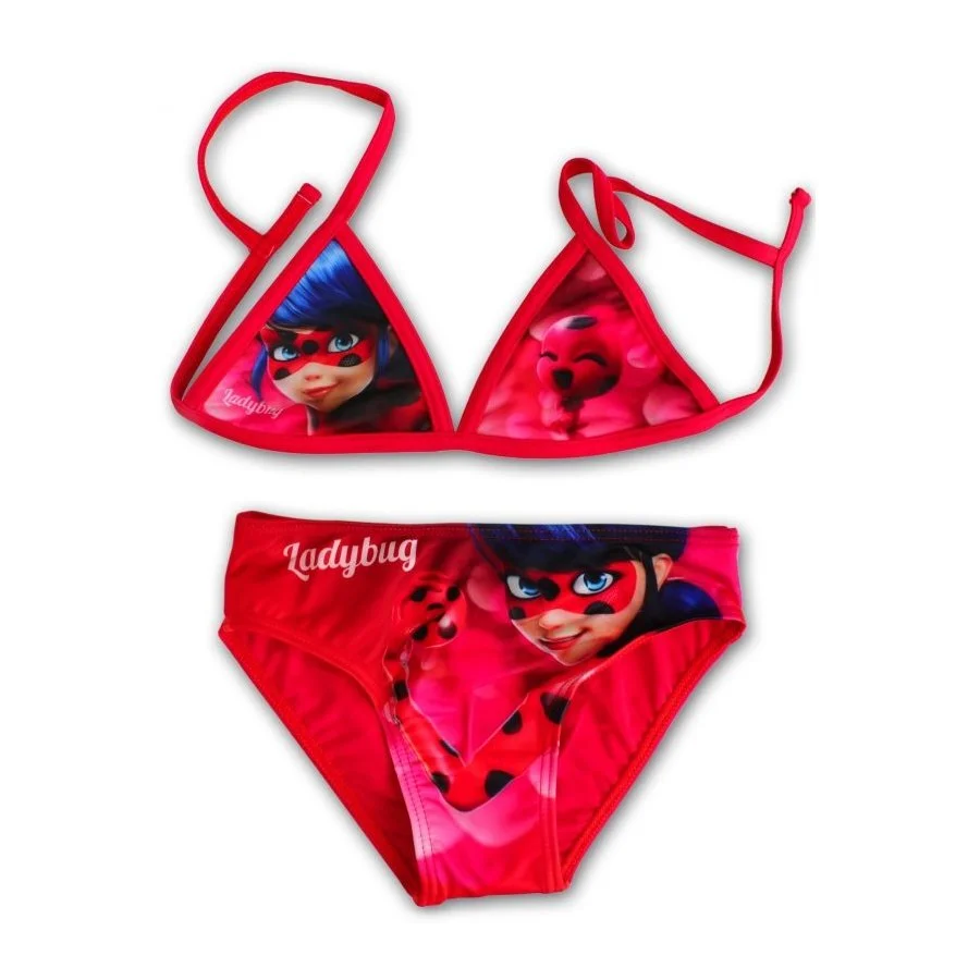 Holčičí dvojdílné plavky Kouzelná beruška - Miraculous Ladybug. Červené dívčí bikiny s motivem z animovaného seriálu Kouzelná beruška a Černý kocour. Spodní díl těchto plavek má v pase gumu a v intimní části vnitřní podšívku z bílého úpletu. Horní díl má ze zadní strany rozepínací sponu. Materiál plavek je poměrně elastický, takže se dobře přizpůsobí velikosti a pohodlně se nosí.
