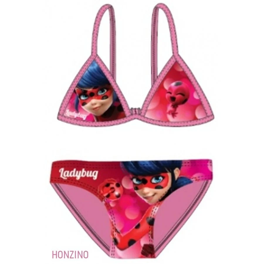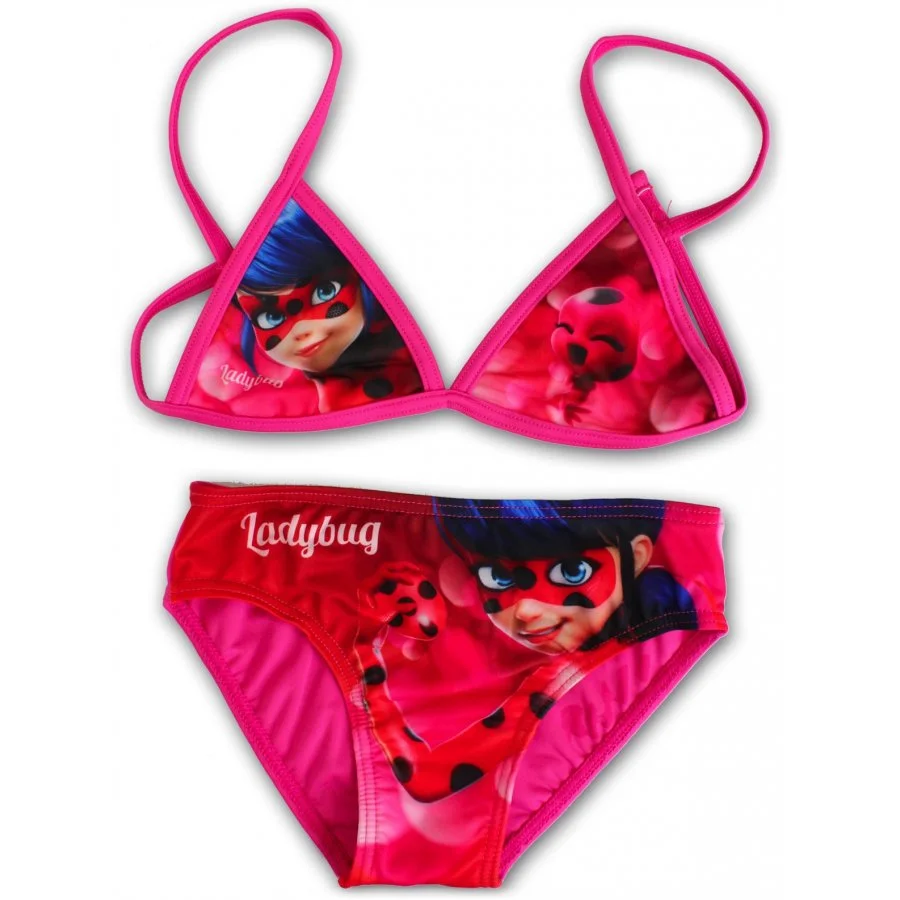 Holčičí dvojdílné plavky Kouzelná beruška - Miraculous Ladybug. Růžové dívčí bikiny s motivem z animovaného seriálu Kouzelná beruška a Černý kocour. Spodní díl těchto plavek má v pase gumu a na spodní části z vnitřní strany podšívku z bílého úpletu. Horní díl má zezadu rozepínací sponu. Materiál plavek je poměrně elastický, takže se dobře přizpůsobí velikosti a pohodlně se nosí.