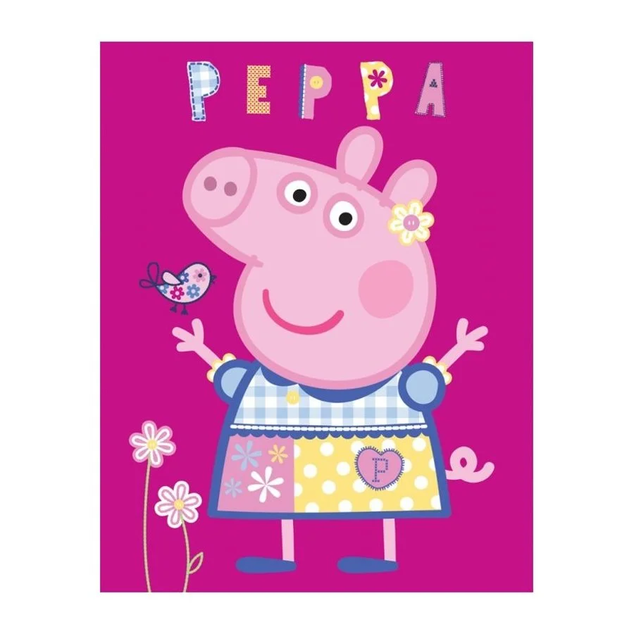 Dětská flísová deka Prasátko Peppa - motiv modelka s obrázkem Pepiny v parádních šatech na růžovém podkladu. Je vyrobená z příjemného, měkoučkého a hřejivého fleece obšitého bavlnkou. Tato deka má široké uplatnění po celý rok. Vaše děti se jí mohou zakrýt když jim bude chladno, nebo na ní mohou ležet a hrát si. Rozměry této deky Prasátko Peppa jsou 110 x 140 cm.