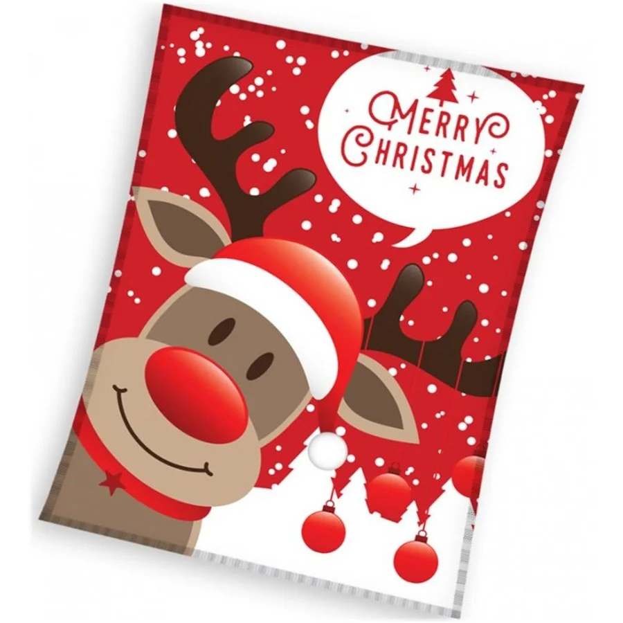 Velká fleecová deka s vánočním motivem. Zdobí ji obrázek soba Rudolfa, který je vánočně vyladěný vánoční čepičkou a baňkami na paroží. Ideální vánoční pohodu dokresluje sníh v pozadí. Tato deka je vyrobena z měkoučkého a hřejivého coral fleece s gramáží 240 gsm. Její rozměry jsou 150 x 200 cm, hmotnost 750g.