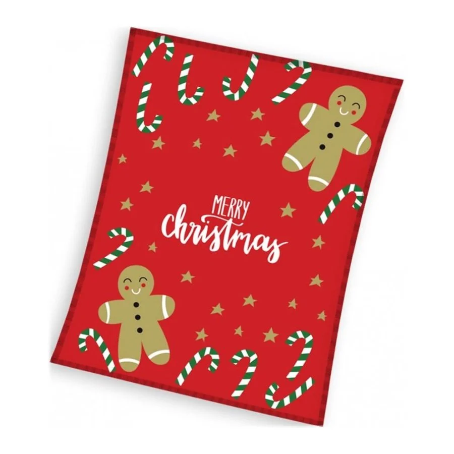 Lehká flísová deka s vánočním motivem. Zdobí ji motiv s panem Perníčkem, cucavými lízátky a nápisem "Merry christmas", tedy česky Veselé Vánoce. To vše na podkladu stejně červeném, jako je Santův plášť. Tato deka je vyrobena z fleece s gramáží 180 gsm. Její rozměry jsou 130 x 170 cm, hmotnost 390g.