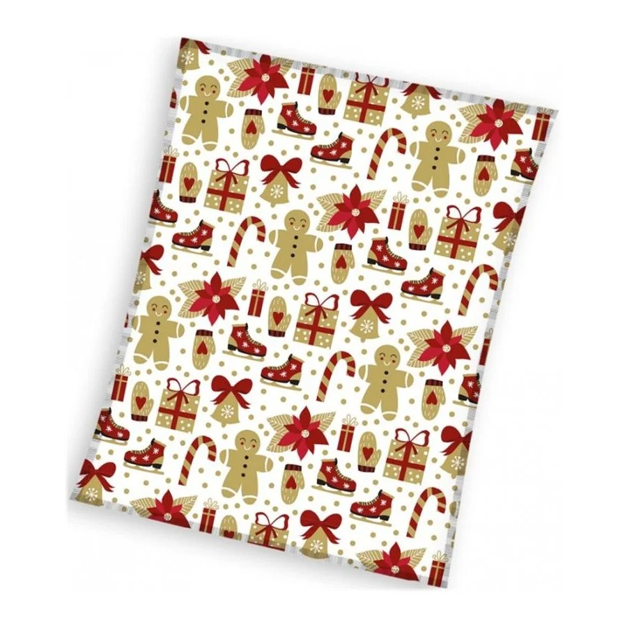 Velká fleecová deka s vánočním motivem. Zdobí ji obrázky dárečků, perníčků a vánočních růži. Zimní atmosféru dokreslují ještě obrázky bruslí a rukavic. Tato deka je vyrobena z měkoučkého a hřejivého coral fleece s gramáží 240 gsm. Její rozměry jsou 150 x 200 cm, hmotnost 750g.