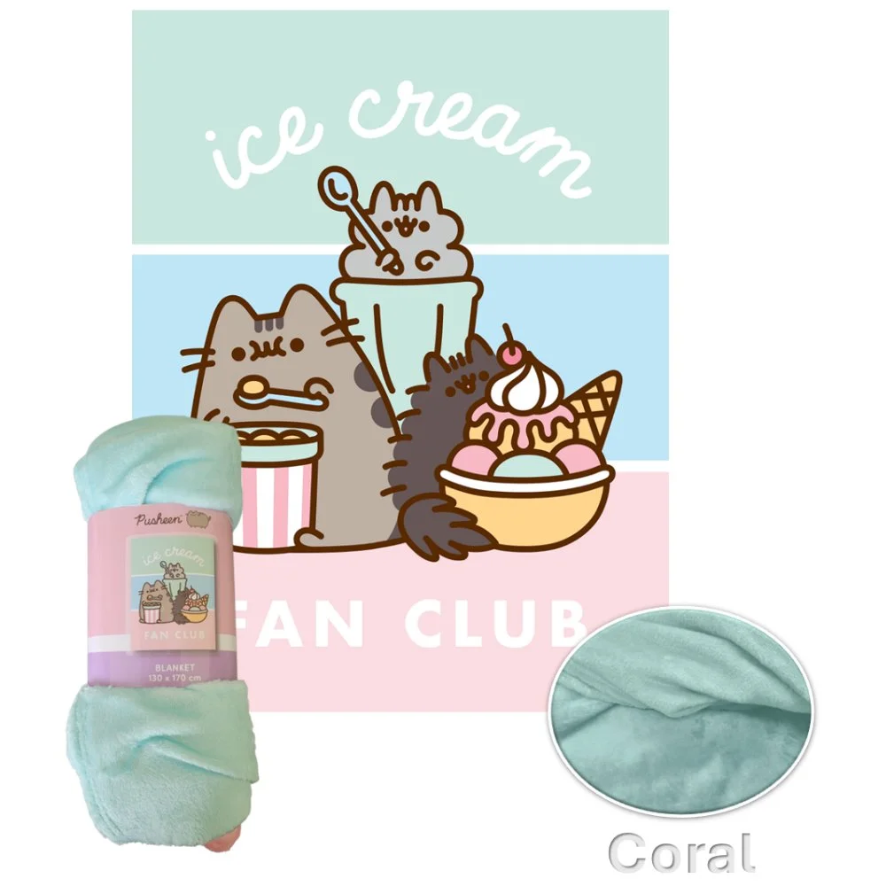 Měkoučká deka z korálového flísu s motivem Pusheen - Klub milovníků zmrzliny potěší všechny fanoušky této roztomilé kočky. Je hebká, hřejivá a ideální na lenošení doma i na cestách. Její barvy zůstávají výrazné i po mnoha vypráních a její rozměry jsou 130 x 170 cm.