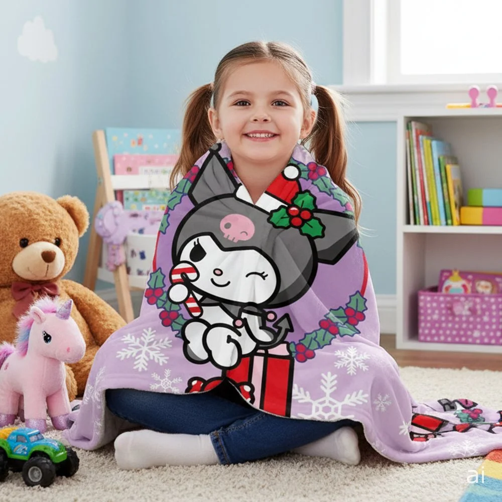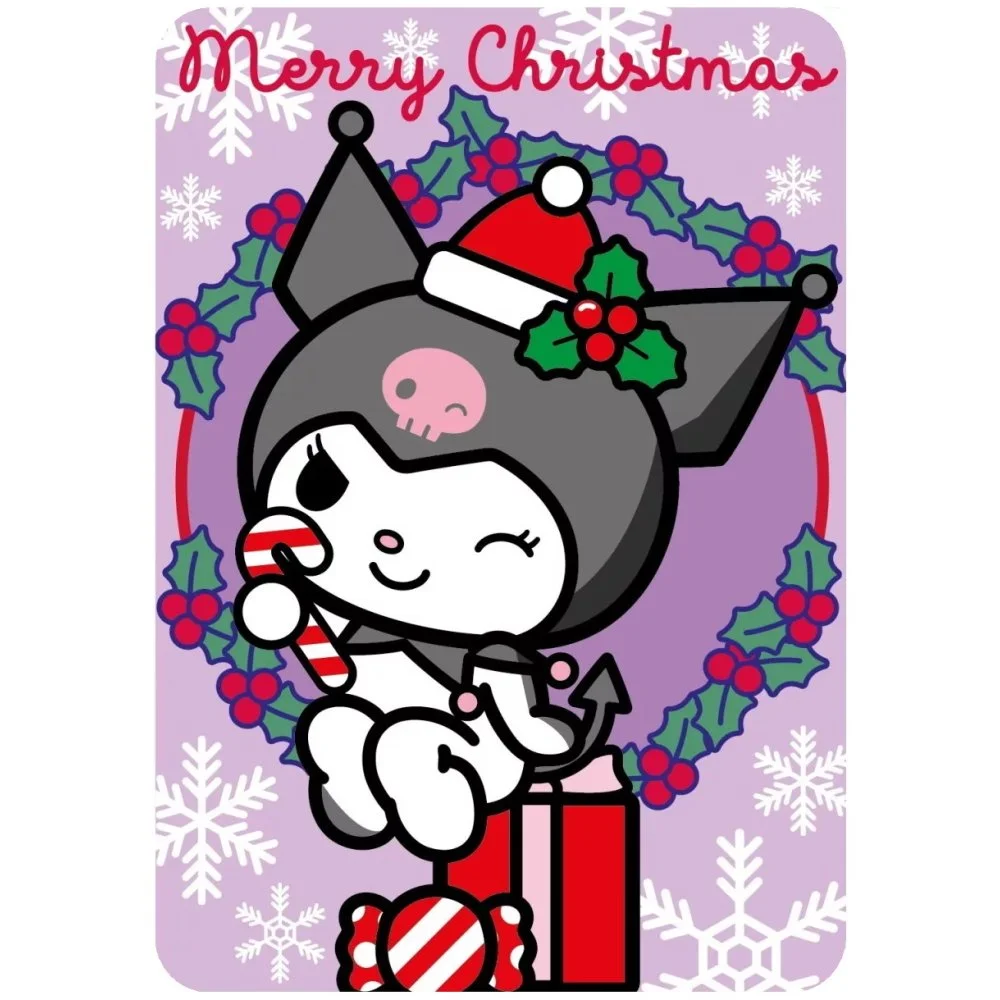 Vánoční flísová deka Kuromi s veselým motivem oblíbené postavičky s červenou vánoční čepičkou a lízátkem. Vyrobená z příjemného polar fleece, který si zachovává syté barvy i po opakovaném praní. Rozměr 100 × 140 cm.