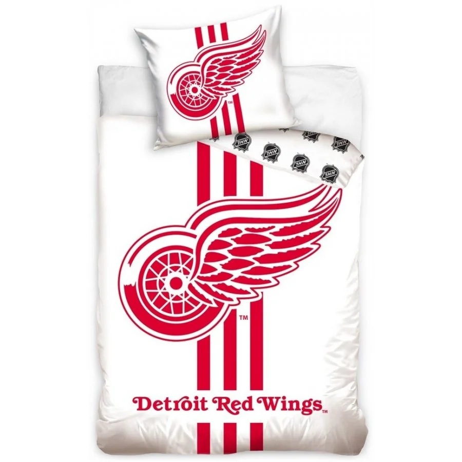 Ložní povlečení NHL Detroit Red Wings. Toto povlečení je vyrobeno ze 100% bavlny - perkálu, tedy materiálu, který není zcela obvyklý v tomto produktovém segmentu. Takto vysokou kvalitu ocení zejména náročnější zákazníci. Přední stranu povlečení zdobí logo tohoto hokejového klubu z Detroitu - červená křídla. Červená a bílá jsou taktéž klubovými barvami. Zadní strana obou částí povlečení je poseta malými logy NHL. Rozměr povlaku polštáře je 70 x 90 cm, rozměr povlaku přikrývky je 140 x 200 cm, zapínání je na zip.