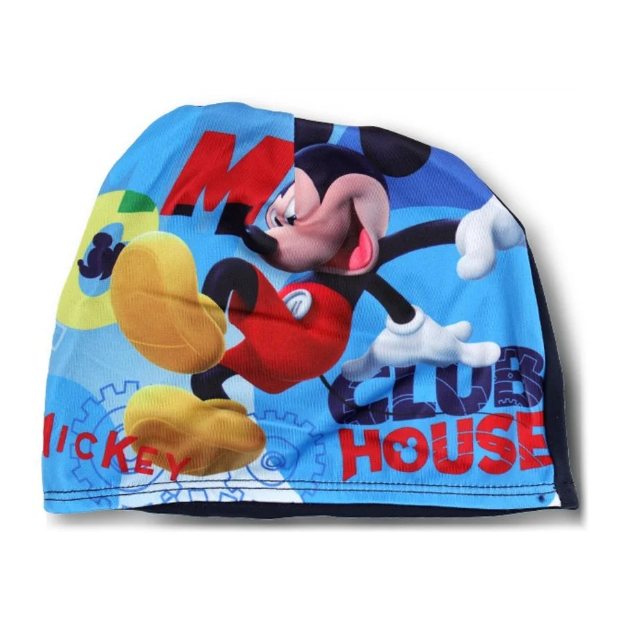 Chlapecká plavecká čepice Mickey Mouse - Club House. Je vyrobená z příjemně jemného, elastického materiálu, který rychle schne. V lemu je navíc guma. Z jedné strany čepice je potisk, druhá strana je tmavě modrá. Jedna univerzální velikost - pro děti.