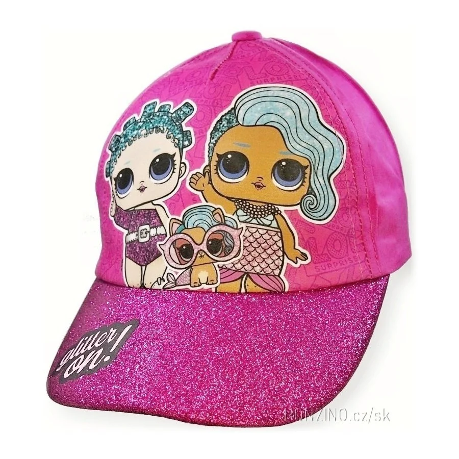 Dětská baseballová čepice s kšiltem s třpytkami L.O.L. Surprise - sytě růžová. Přední stranu čepice zdobí obrázek okatých panenek L.O.L. Zadní část této čepice LOL a spodní část dobře vyztuženého kšiltu je tmavě růžová. Ze zadní strany je také nastavovací pásek se suchým zipem.