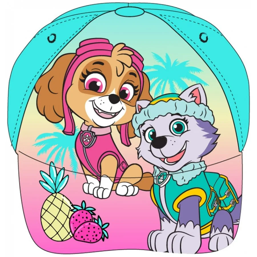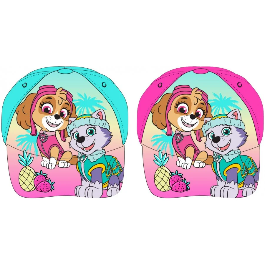 Dětská baseballová čepice s kšiltem Paw Patrol - Tlapková patrola - motiv Skye a Everest. Přední stranu čepice a horní část kšiltu zdobí obrázek psích záchranářek Skye a Everest na pláži, s palmami v pozadí a s tropickým ovocem. Zbývající část čepice je růžová, nebo tyrkysová - viz výběr velikosti a barvy níže. Ze zadní strany je nastavovací pásek se suchým zipem.
