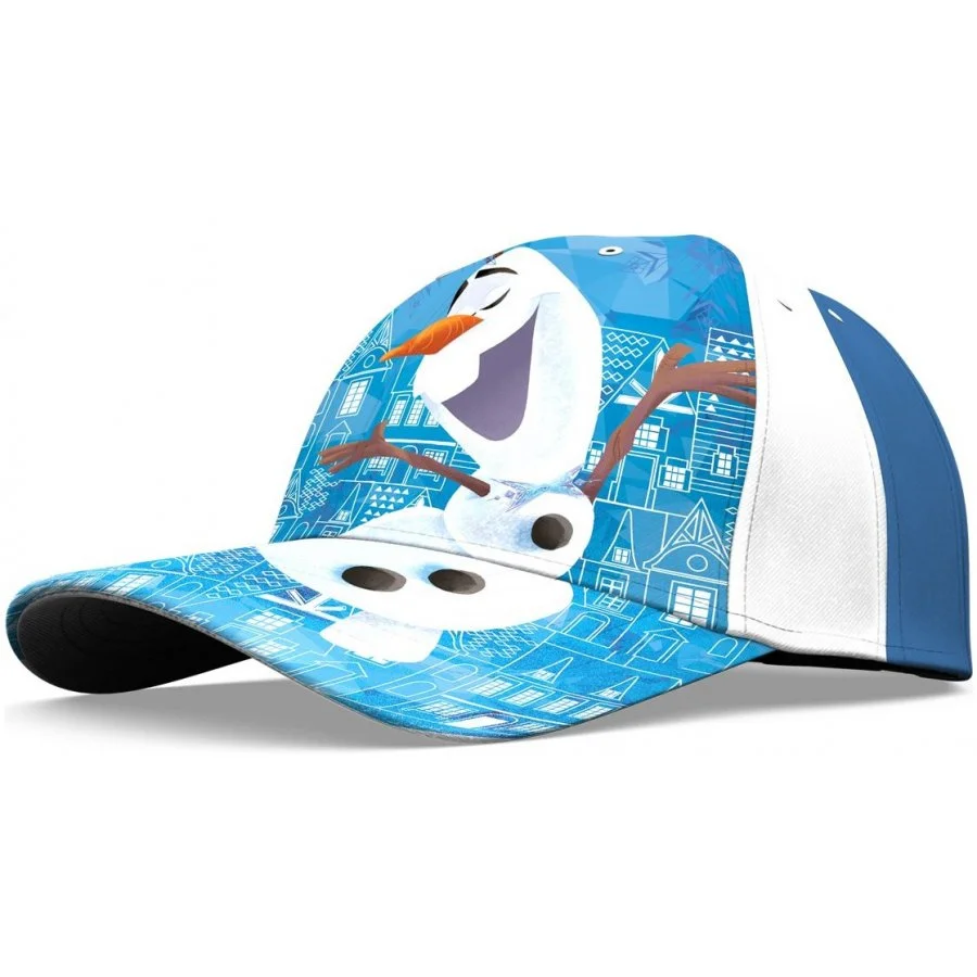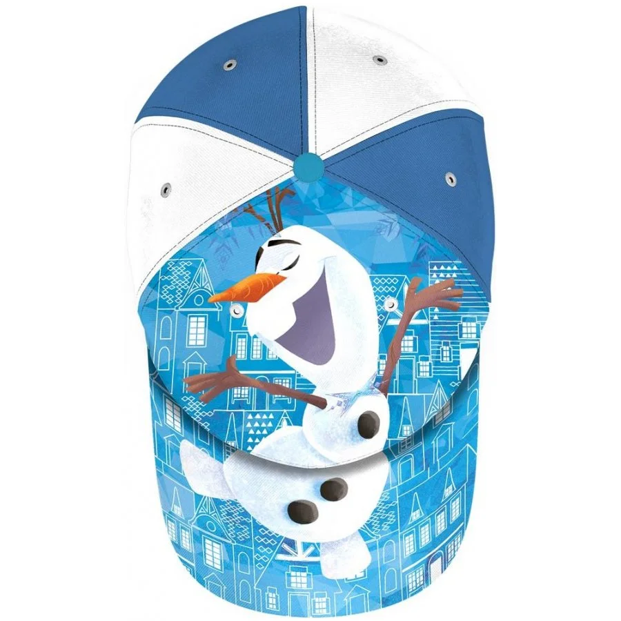 Dívčí baseballová čepice Ledové království - Frozen - motiv Sněhulák Olaf. Přední stranu čepice a kšilt zdobí obrázek Sněhuláka Olafa. Zbývající část čepice je bílo modrá. Ze zadní strany je nastavovací pásek se suchým zipem.