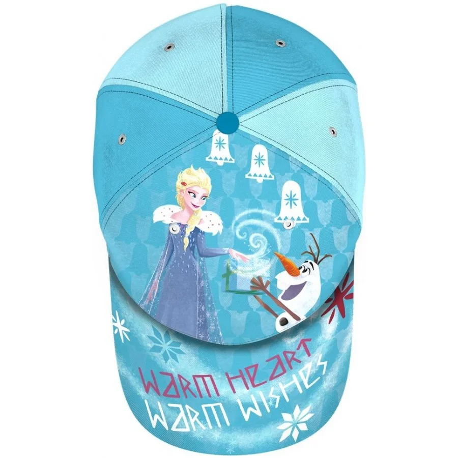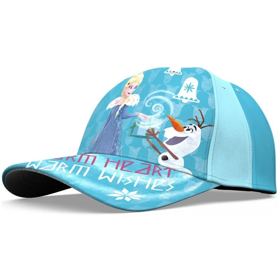Dívčí baseballová čepice Ledové království - Frozen - motiv Warm heart. Přední stranu čepice a kšilt zdobí obrázek princezny Elsy a Sněhuláka Olafa a nápisy Warm heart - Warm wishes, což lze přeložit jako Vřelé srdce - Vřelá přání. Zbývající část čepice je tyrkysová se střídajícími se dvěma odstíny. Ze zadní strany je nastavovací pásek se suchým zipem.