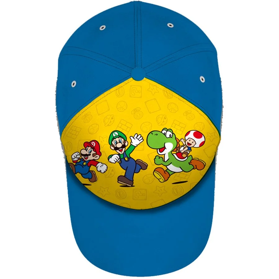 Baseballová čepice s kšiltem Super Mario - licenční produkt Nintendo. Na předním panelu kšiltovky jsou postavy ze série Super Mario - Mario, Luigi, Yoshi a Tod. Zbývající části čepice a kšilt jsou modré. Ze zadní strany je nastavovací pásek se suchým zipem.