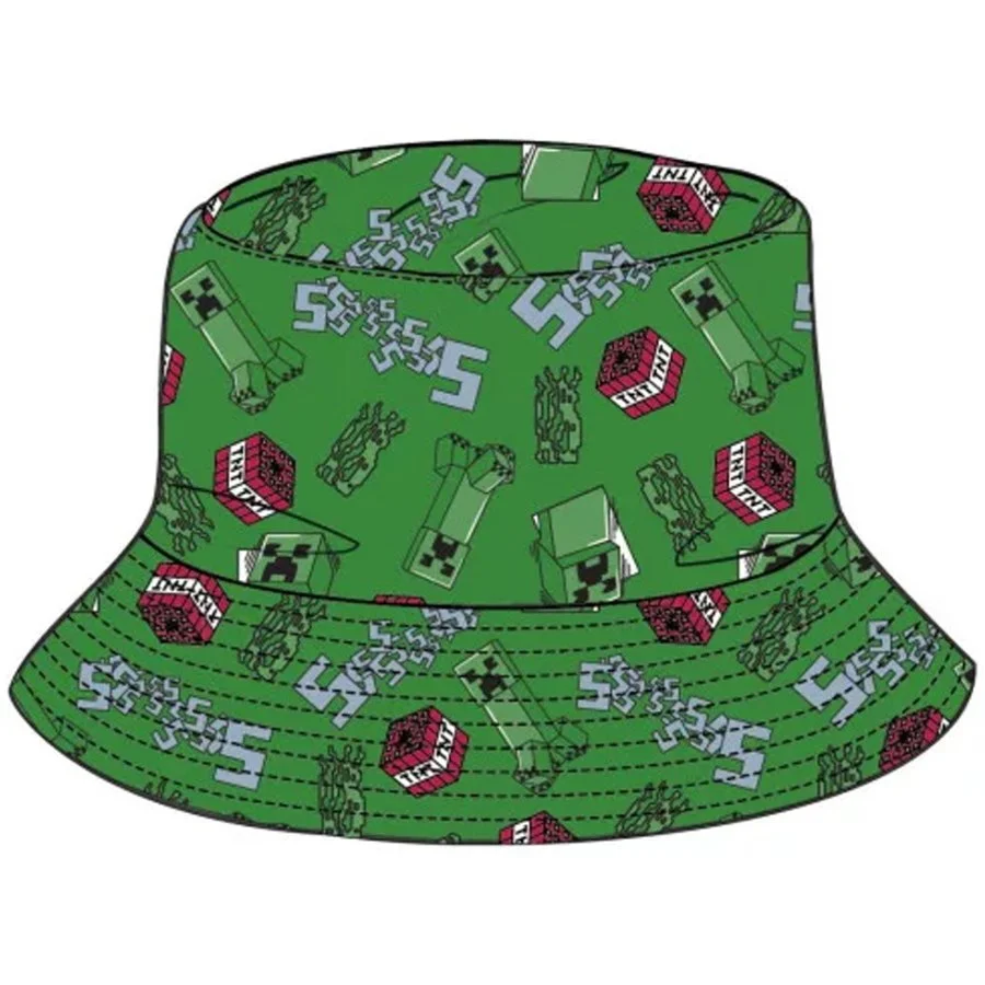 Dětský klobouček Minecraft - motiv Creeper a TNT. Klobouk je zelený s obrázky výbušniny TNT a Creepera, který syčí a tedy se také připravuje k výbuchu.