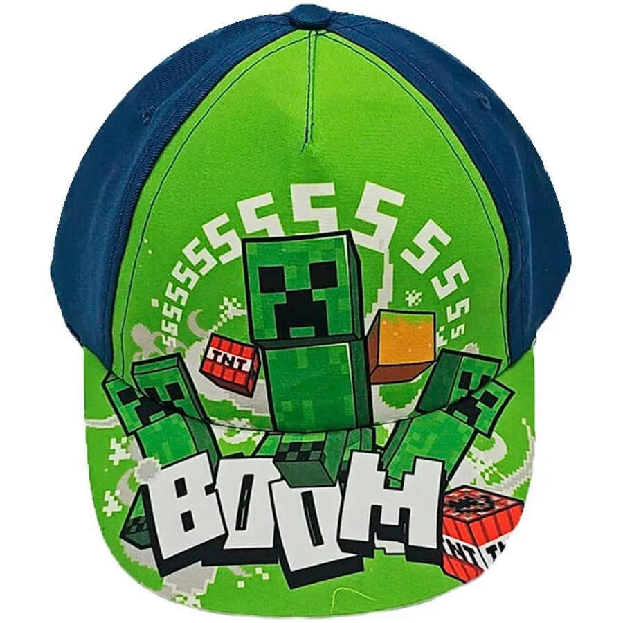 Baseballová čepice s kšiltem Minecraft - motiv BOOM. Na předním panelu kšiltovky a na kšiltu je nápis BOOM obrázek a tří Creeperů z legendární hry Minecraft. Zbývající část čepice je modrá. Ze zadní strany je nastavovací pásek se suchým zipem. Tuto kšiltovku Minecraft nabízíme ve vel. 54 pro děti cca 8-11 let, nebo 56 pro teenagery cca 12-15 let.