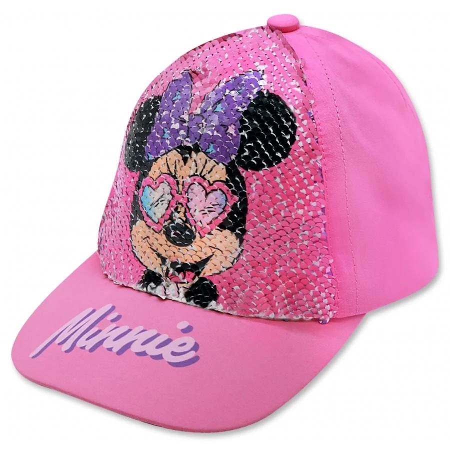 Dětská baseballová čepice Minnie Mouse - Disney s měnícími se glitry. Přední stranu čepice zdobí flitry tvořící obrázek myšky Minnie. Po přejetí se třpytky převrátí a myška Minnie se změní - viz obrázky. Zadní část této čepice Disney a spodní část dobře vyztuženého kšiltu je růžová. Ze zadní strany je také nastavovací pásek se suchým zipem.
