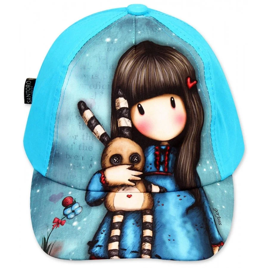 Baseballová čepice Santoro London. Přední stranu čepice zdobí obrázek panenky Gorjuss. Zadní část této čepice Santoro London a spodní část dobře vyztuženého kšiltu je tyrkysová. Ze zadní strany je také nastavovací pásek se suchým zipem.