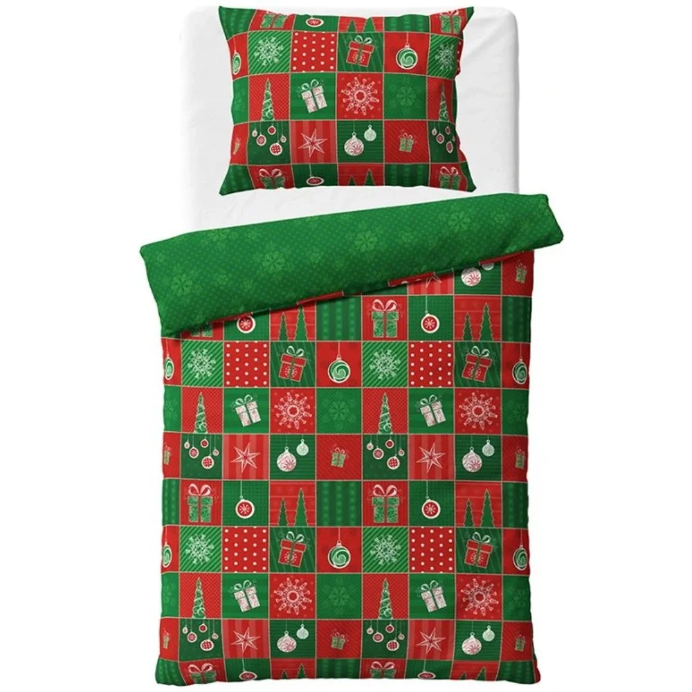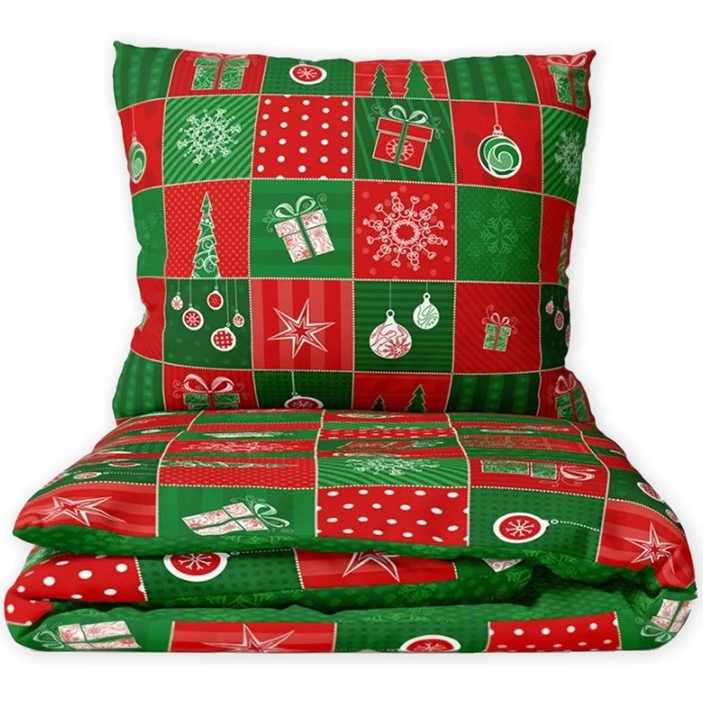 Vánoční ložní povlečení v patchworkovém stylu na červeném a zeleném podkladu přinese do vaší ložnice kouzlo vánoční atmosféry. Je vyrobeno ze 100% bavlny renforcé v rozměru 140 x 200 cm + 70 x 90 cm, se zipovým zapínáním.