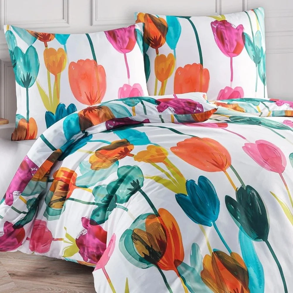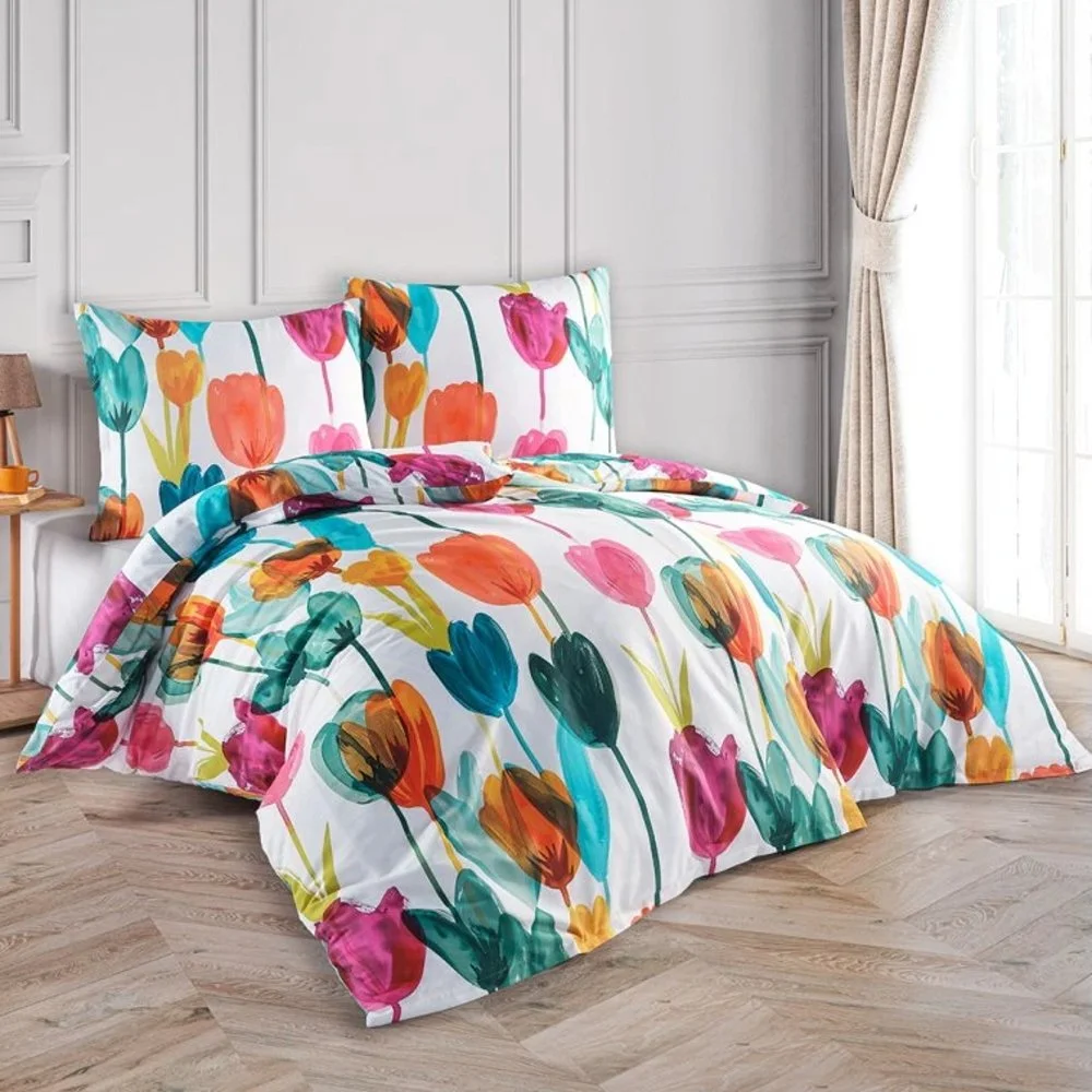 Luxusní bavlněné saténové povlečení Tulipi s velkými květy tulipánů v zářivých odstínech růžové, oranžové, modré, žluté a zelené rozzáří vaši ložnici svěží energií a optimismem. Vyrobeno z prémiové egyptské bavlny s hladkým saténovým povrchem, který je příjemný na dotek a šetrný k pokožce. Rozměry 140 × 200 cm a 70 × 90 cm, se zapínáním na zip.