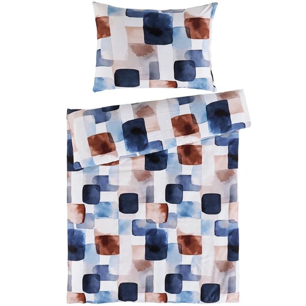 Luxusní bavlněné saténové povlečení Echo s moderním geometrickým vzorem v odstínech modré, hnědé a béžové dodá vaší ložnici elegantní a nadčasový vzhled. Vyrobeno z prémiové egyptské bavlny s hladkým saténovým povrchem, který je příjemný na dotek a šetrný k pokožce. Rozměry 140 × 200 cm a 70 × 90 cm, se zapínáním na zip.
