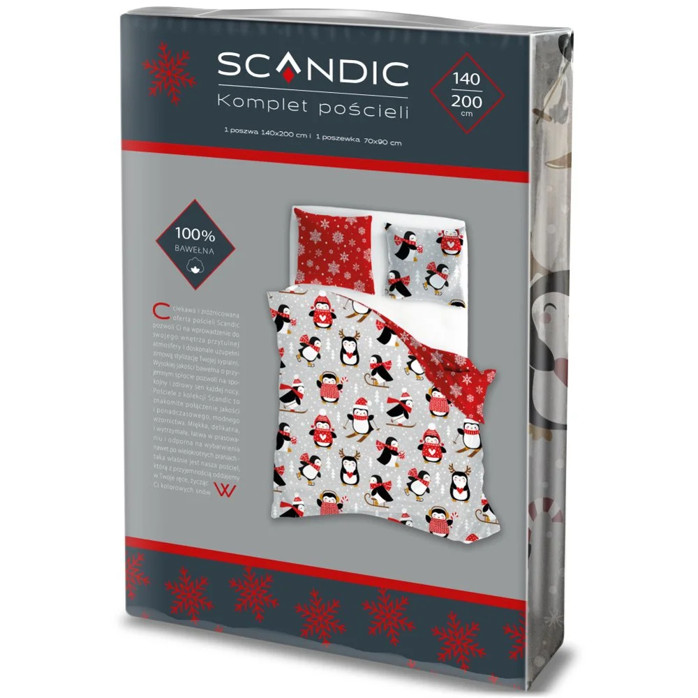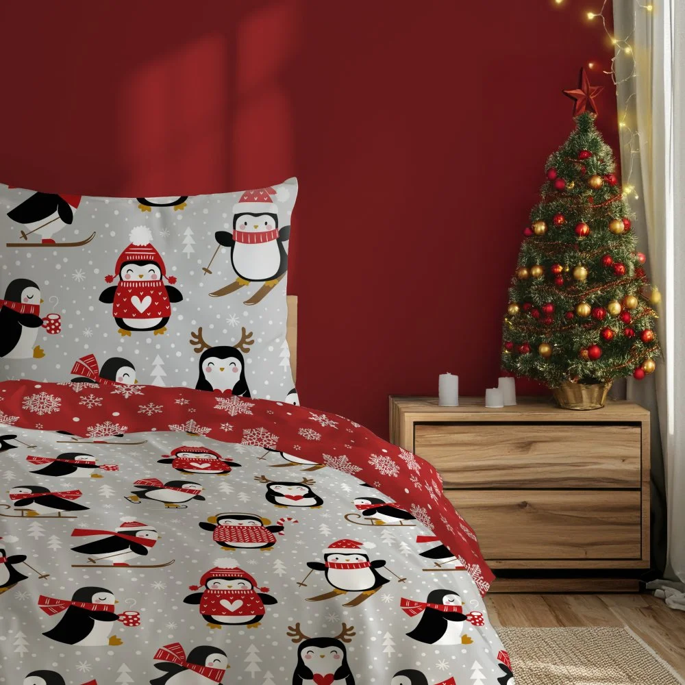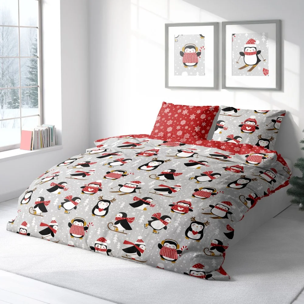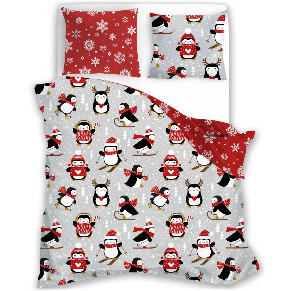 Oboustranná vánoční souprava ložního povlečení s motivem malých tučňáků na světle šedém podkladu a sněhových vloček na červeném podkladu na druhé straně. Povlečení je vyrobeno ze 100% bavlny, obsahuje 1x povlak na přikrývku 140×200 cm a 1x povlak na polštář 70×90 cm (±3 %), zapínání je na zip.