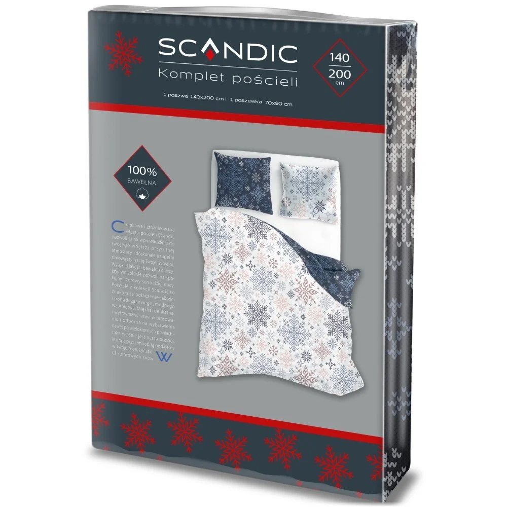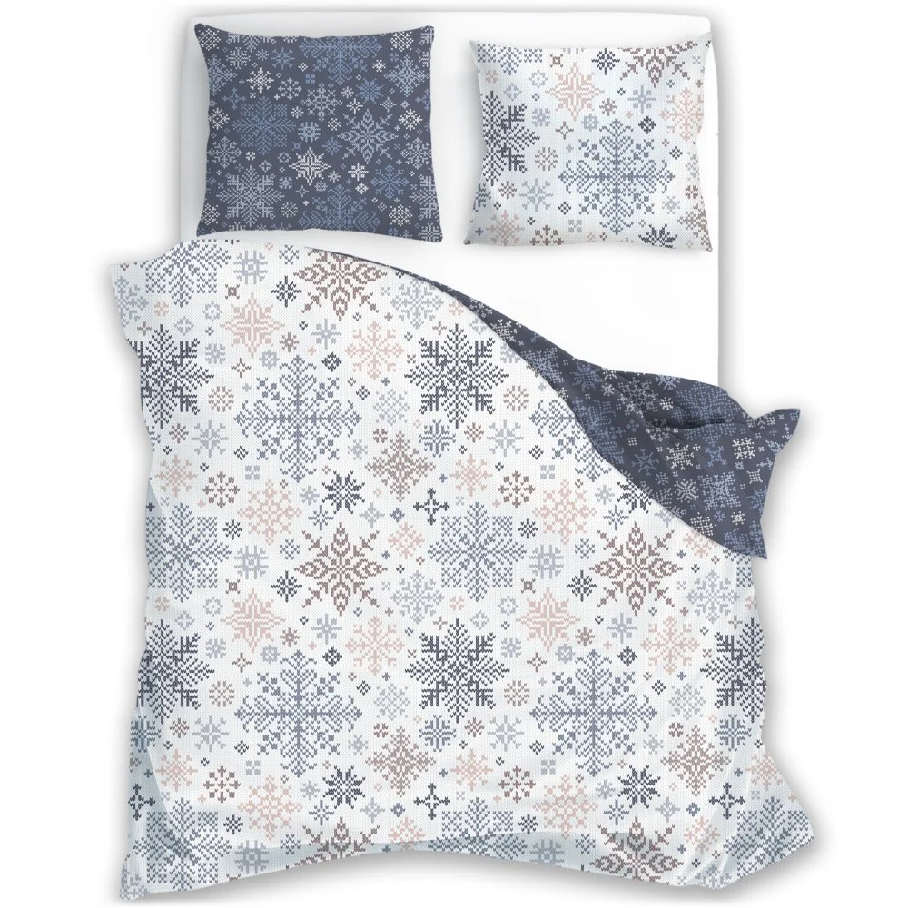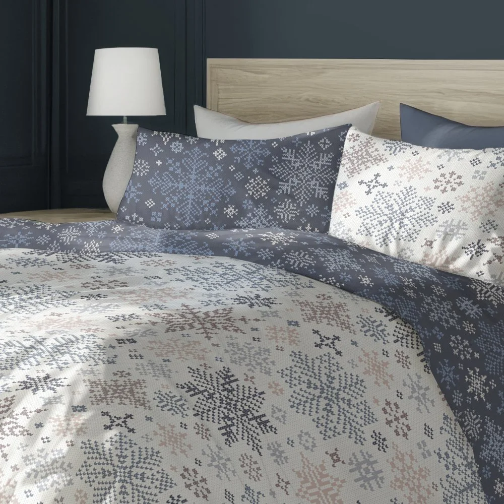 Oboustranná vánoční souprava ložního povlečení s motivem sněhových vloček na bílém podkladu, nebo ocelově šedém podkladu na druhé straně. Povlečení je vyrobeno ze 100% bavlny, obsahuje 1x povlak na přikrývku 140×200 cm a 1x povlak na polštář 70×90 cm (±3 %), zapínání je na zip.
