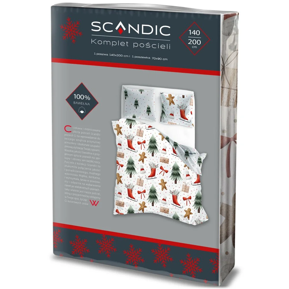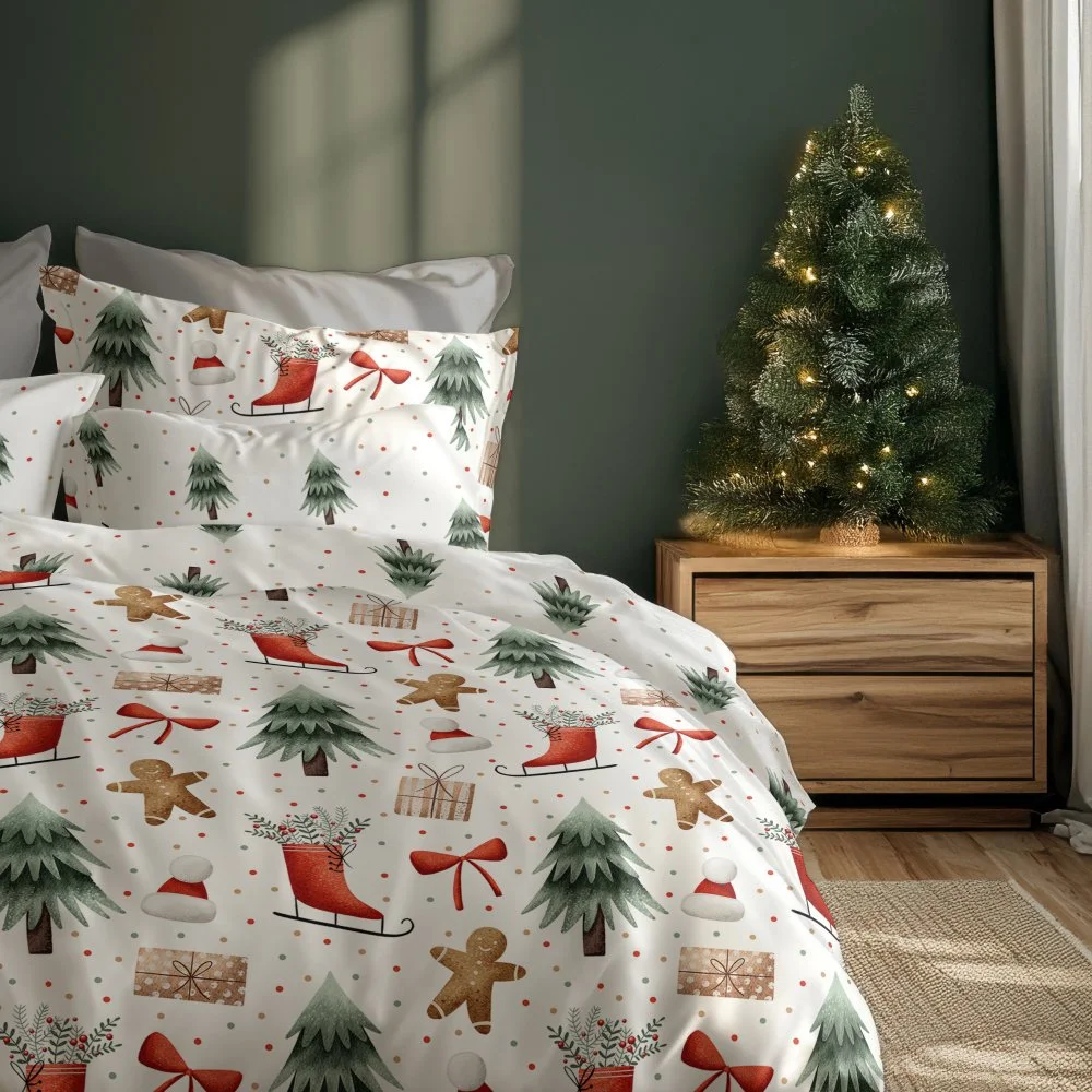 Souprava ložního povlečení s veselým motivem Santů, sobů, dárků, červených mašlí a vánočních ...