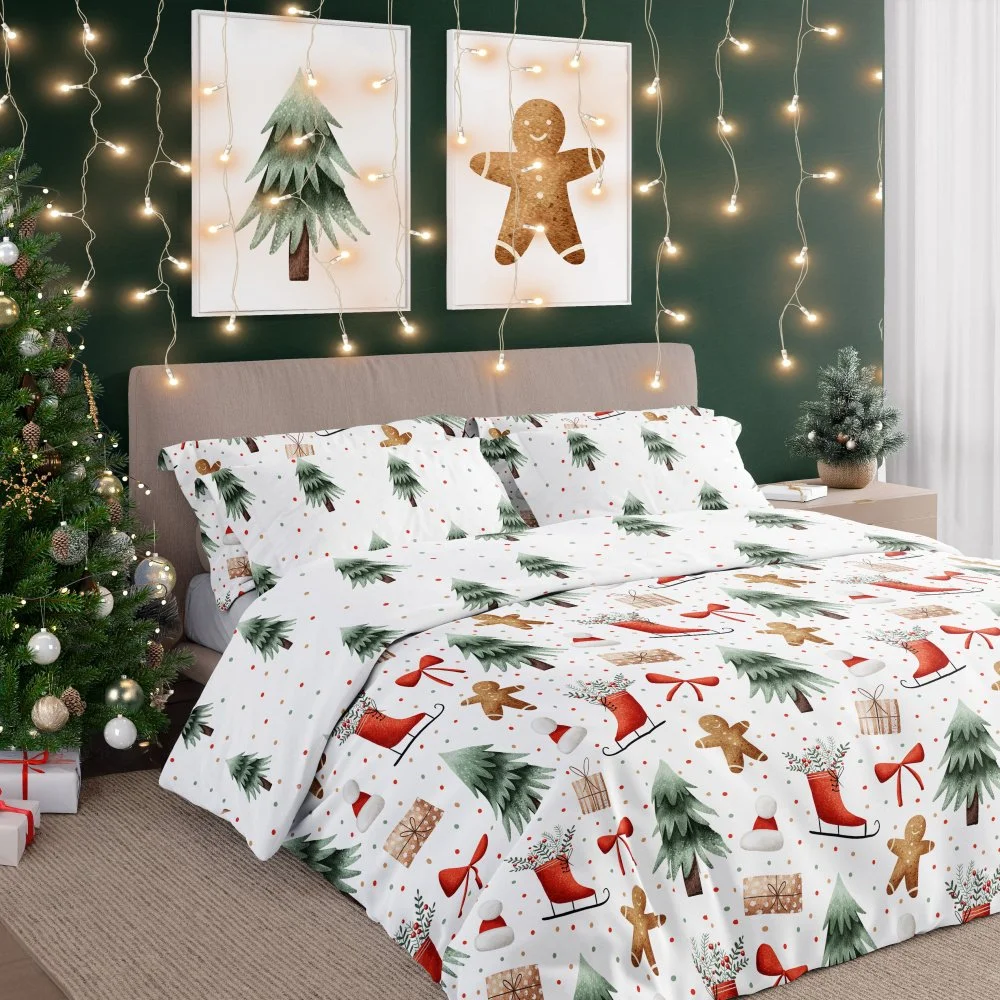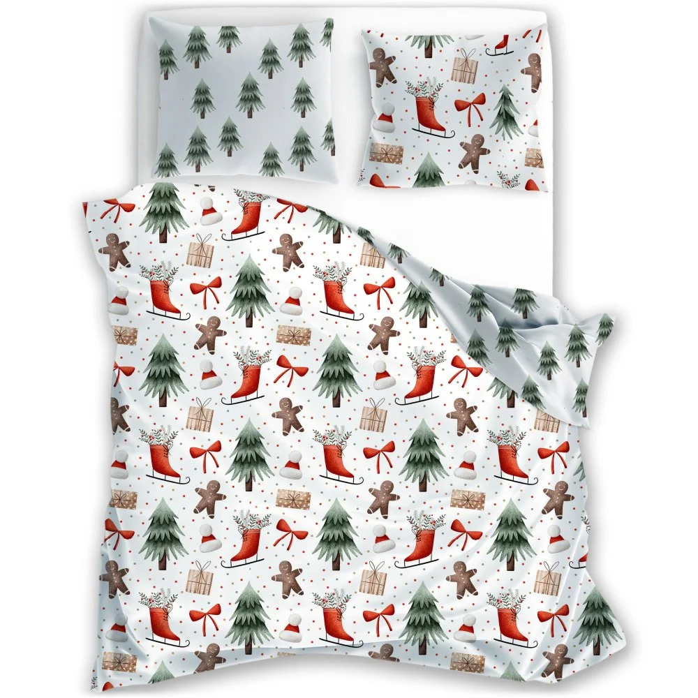 Oboustranná vánoční souprava ložního povlečení s motivem perníčků a dalších vánočních motivů na bílém podkladu, na druhé straně je celý les vánočních jedliček. Povlečení je vyrobeno ze 100% bavlny, balení obsahuje 1x povlak na přikrývku 140×200 cm a 1x povlak na polštář 70×90 cm (±3 %), zapínání je na zip.