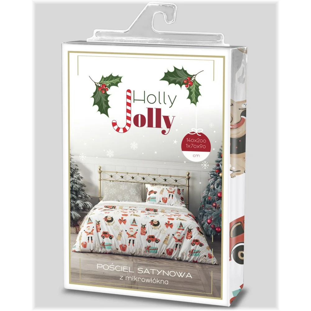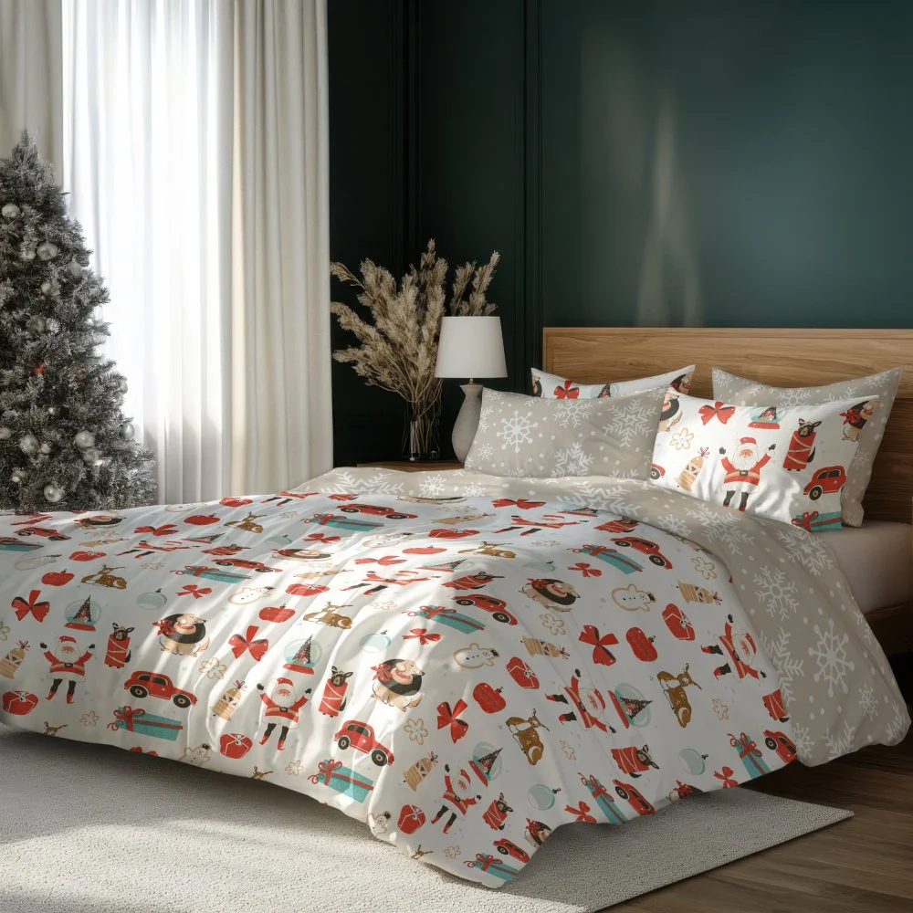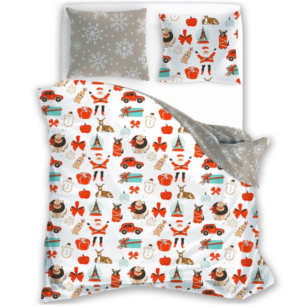 Souprava ložního povlečení s veselým motivem Santů, sobů, dárků, červených mašlí a vánočních ozdob na bílém podkladu, zatímco druhou stranu zdobí vzor sněhových vloček na béžovém pozadí. Povlečení je vyrobeno z mikrovlákna se saténovým povrchem, balení obsahuje 1x povlak na přikrývku 140×200 cm a 1x povlak na polštář 70×90 cm (±4 %), zapínání je na zip.
