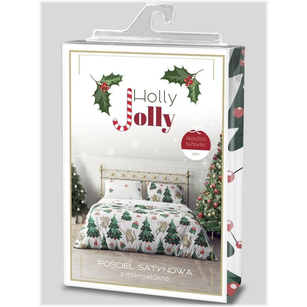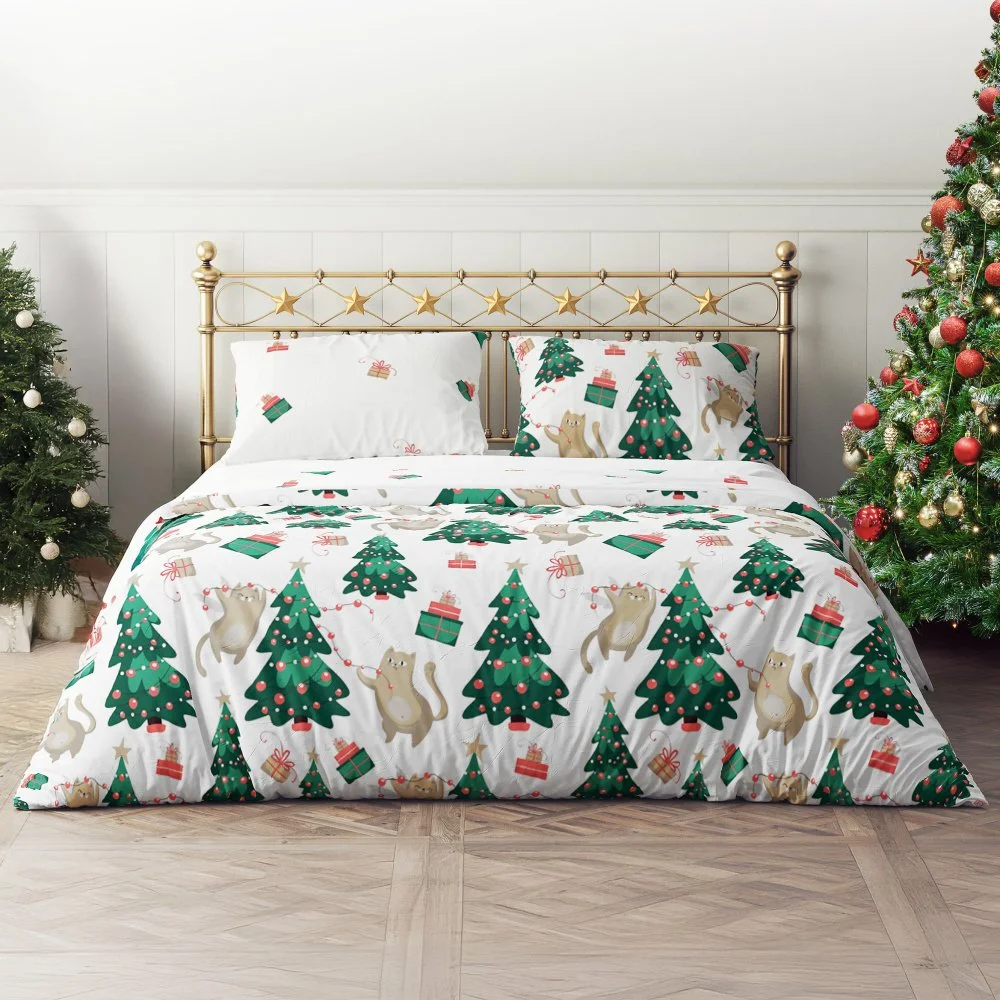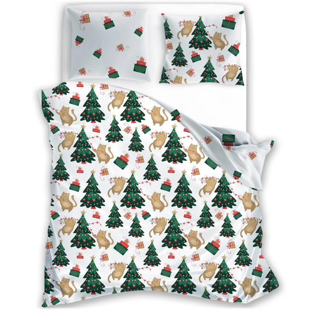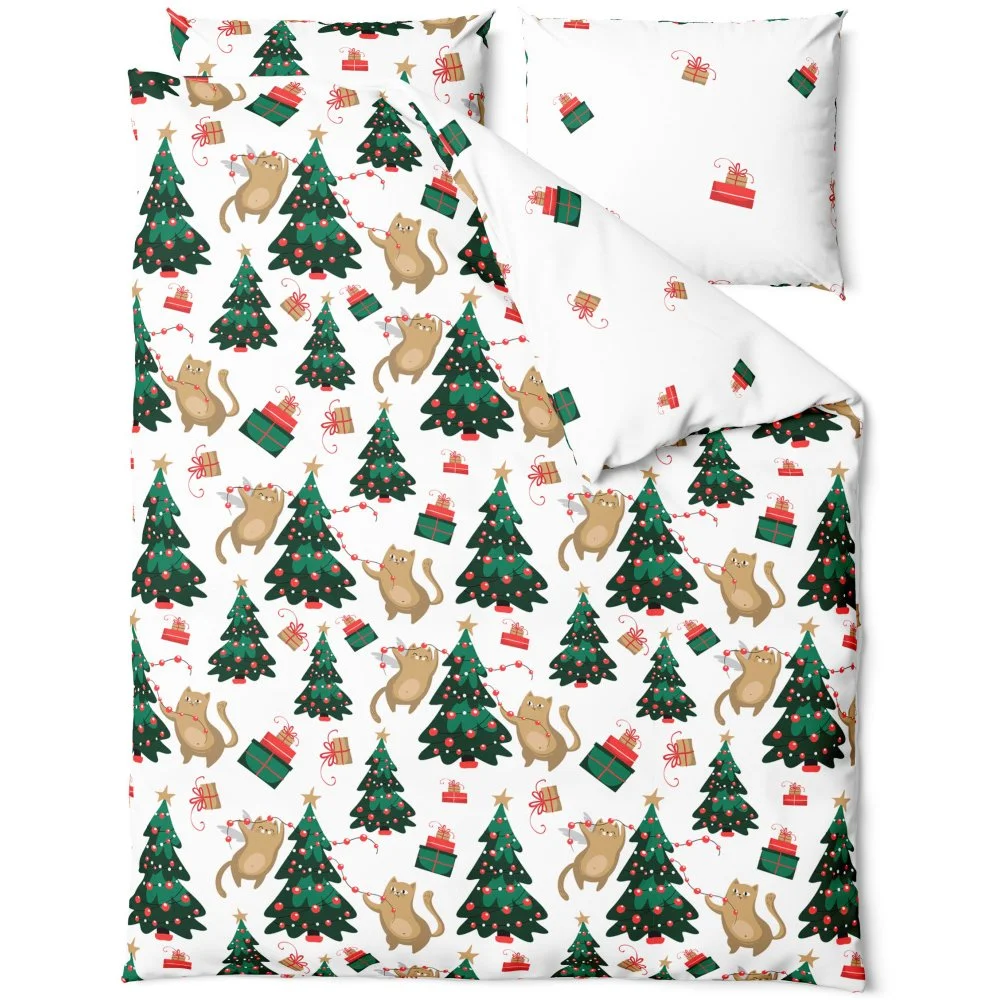 Souprava ložního povlečení s hravým motivem koček a vánočních stromečků na jedné straně, zatímco druhou stranu zdobí vzor dárečků na bílém pozadí. Povlečení je vyrobeno z mikrovlákna se saténovým povrchem, balení obsahuje 1x povlak na přikrývku 140×200 cm a 1x povlak na polštář 70×90 cm (±4 %), zapínání je na zip.
