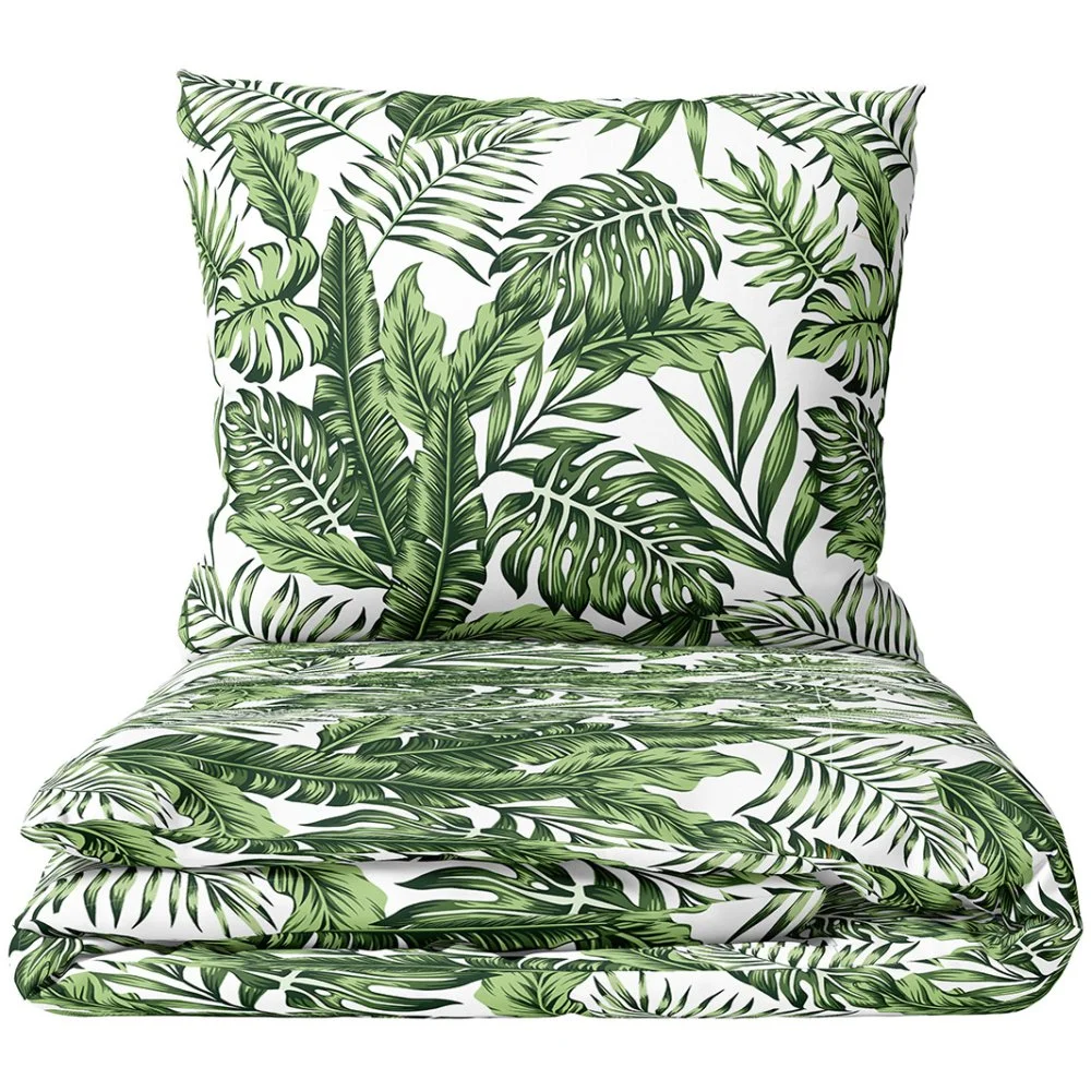 Souprava bavlněného ložního povlečení Jungle Leaves z kolekce BedTex Home Line s výrazným tropickým motivem zelených listů na bílém podkladu. Vyrobena ze 100% bavlny Renforcé. Rozměry 140 × 200 cm a 70 × 90 cm, zapínání na zip.
