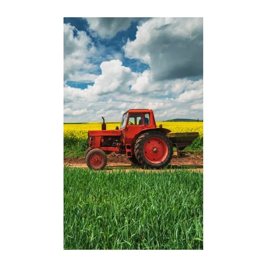 Dětský ručníček Červený traktor. Zdobí jej obrázek retro traktůrku, který jede na pole sklízet řepku.