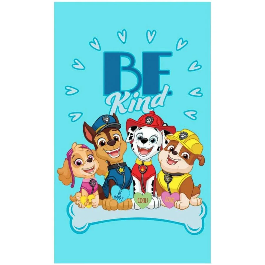 Dětský ručníček Tlapková patrola - Paw Patrol - motiv Be Kind. Zdobí jej obrázek štěňat Skye, Chase, Marshalla a Ruble na tyrkysovém podkladu. Je vyroben ze 100% bavlny. Lícní strana ručníku je tvořena jemně střiženým froté s velurovým povrchem, proto je velice příjemná na dotek. Na rubu jsou hustě tkané froté smyčky, které zajišťují skvělou savost. Tento ručníček je potištěný digitální technologií a proto jsou jeho barvy syté a výrazné. Navíc jsou jsou velice intenzivní i po mnoha vypráních. Rozměry tohoto dětského ručníku jsou 30 x 50 cm, proto se vejde třeba i do batůžku na výlet. Vhodný je však i do školy, či do školky.