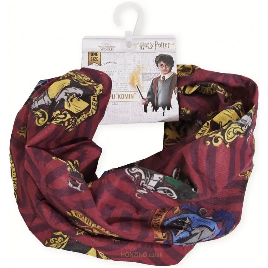 Dětský multifunkční šátek Harry Potter. Zdobí jej erby kolejí Školy čar a kouzel v Bradavicích, tedy erby Nebelvíru, Zmijozelu, Mrzimoru a Havraspáru.