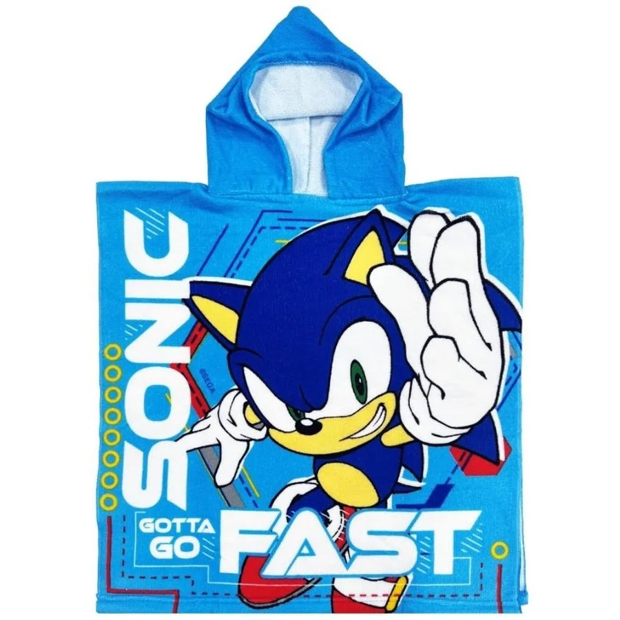 Rychleschnoucí plážová osuška s kapucí / dětské pončo Ježek Sonic. Je vyrobené z příjemně jemného polyesteru s úpravou Fast Dry pro rychlejší schnutí. Zdobí jej obrázek ježka Soníka, který je rychlejší než zvuk, a nápis s jeho jménem. Rozměry tohoto ponča jsou 55 x 110 cm (55 x 55 cm přední díl a 55 x 55 cm zadní díl).