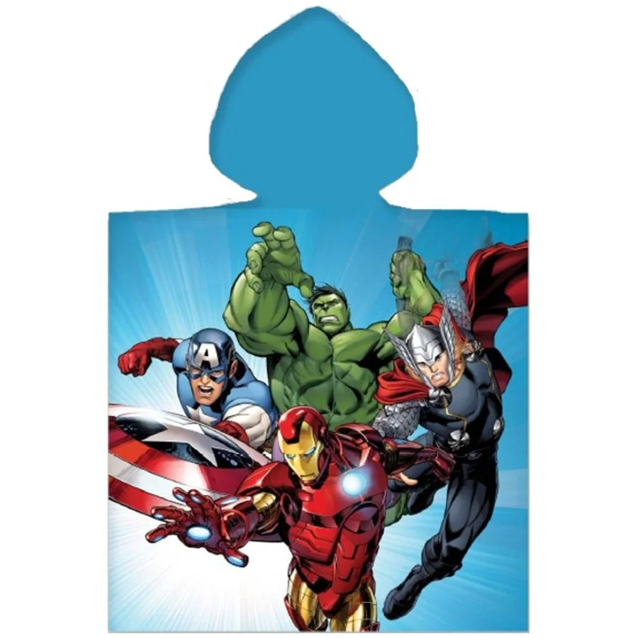 Dětská bavlněná osuška s kapucí pro kluky / chlapecké plážové pončo Avengers - MARVEL. Toto osuškové pončo je vyrobené z příjemně jemného a dobře savého 100% bavlněného froté s gramáží 320 g/m². Je ideální nejen na doma po koupeli, ale i na koupaliště, nebo na pláž třeba na dovolené u moře. Obě strany ponča zdobí obrázek superhrdinů z týmu Avengers Hulka, Thora, Kapitána Ameriky a Iron Mana. Rozměry tohoto dětského ponča Avengers jsou 50 x 110 cm (přední část 50 x 55 cm + záda 50 x 55 cm), je tedy vhodné spíše pro menší děti.