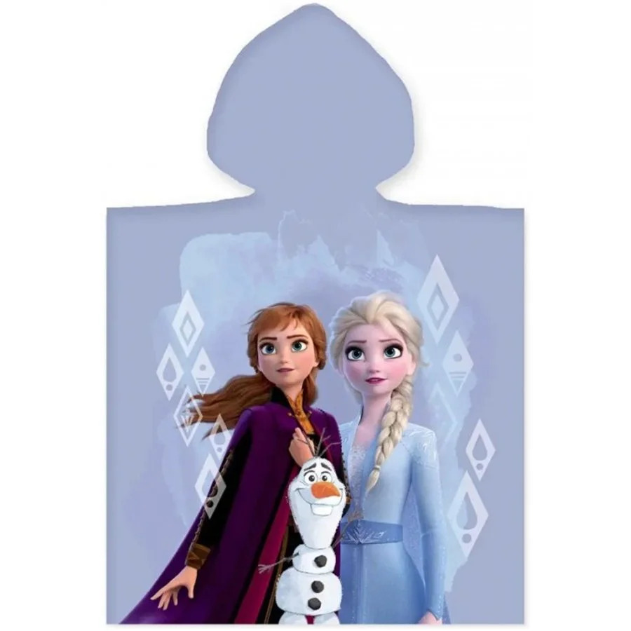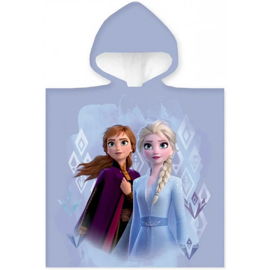 Dětská bavlněná osuška s kapucí / dětské pončo Ledové království - Frozen - motiv Anna a Elsa. Toto osuškové pončo je vyrobené z příjemně jemného a dobře savého 100% bavlněného froté s gramáží 320 g/m². Je ideální nejen na doma po koupeli, ale i na koupaliště, nebo na pláž třeba na dovolené u moře. Rozměry tohoto dětského ponča Ledové království jsou 50 x 100 cm (přední část 50 x 50 cm + záda 50 x 50 cm), je tedy vhodné spíše pro menší děti.