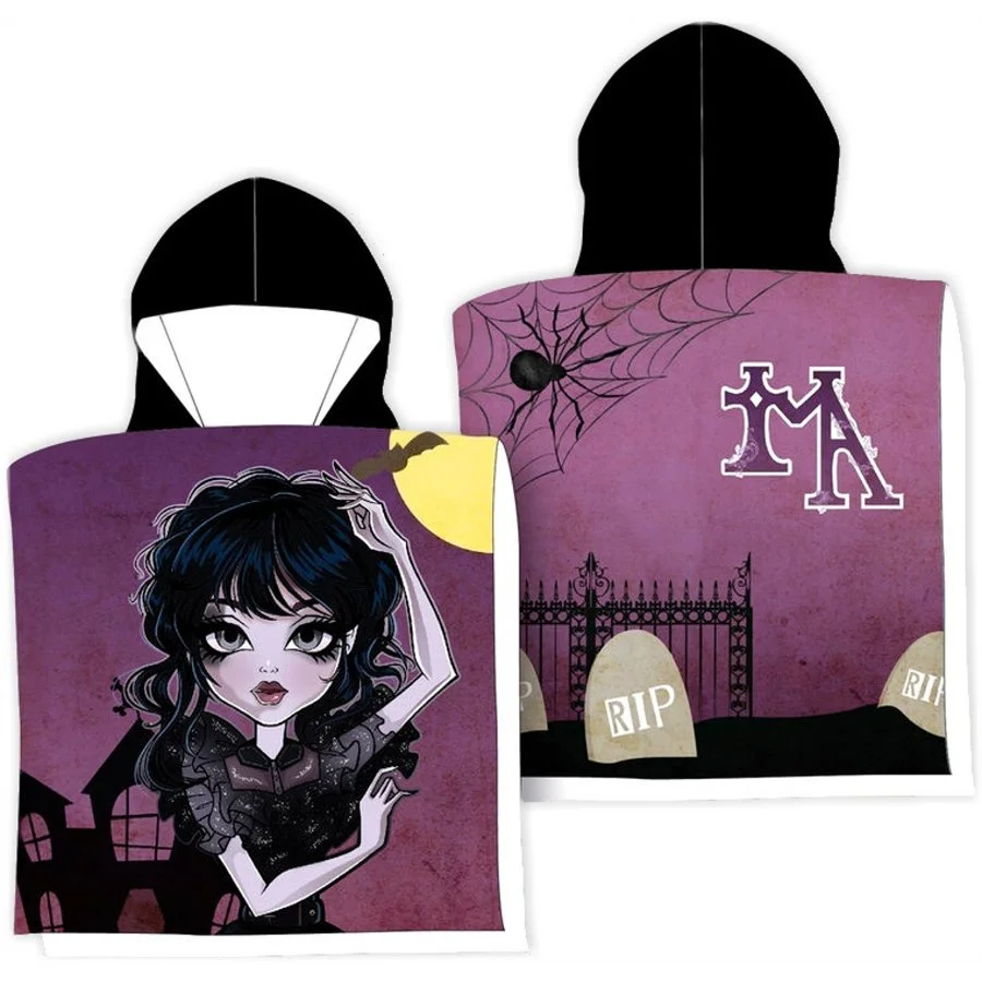 Dětské koupací pončo / bavlněná osuška s kapucí Wednesday - motiv Gothic Girl. Je vyrobená z příjemně jemného a dobře savého 100% bavlněného froté. Na přední straně ponča je obrázek dívky Wednesday Addams při svitu měsíce. Na druhé straně je hřbitov, který k seriálu ... Celý text